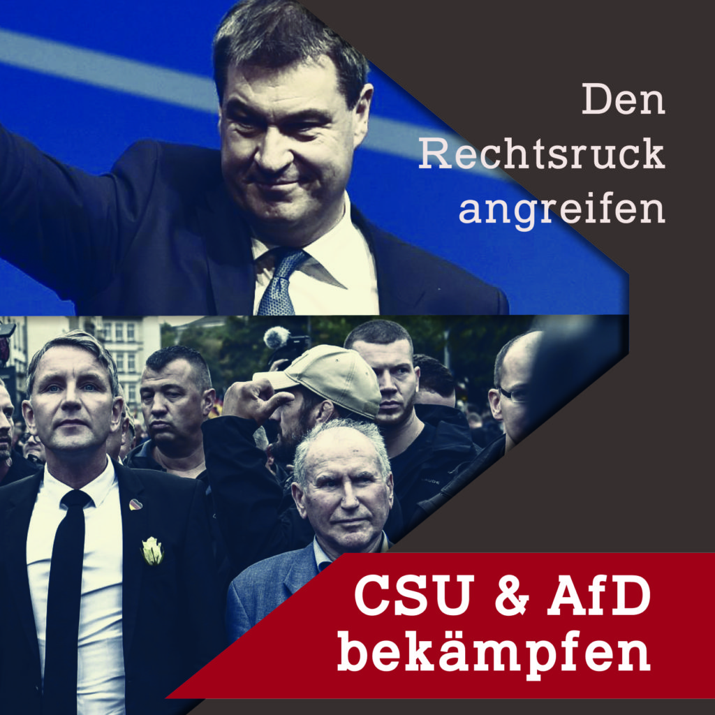 Der Sommer ist vorbei. Und schon der Herbst 2018 droht kalt zu werden. Wir erleben eine Offensive der reaktionären politischen Kräfte. Rassistische Hetze, blutiger Terror gegen MigrantInnen, Nazis in den Parlamenten, mörderische Abschottung gegen Geflüchtete. Der Rechtsruck führt zum autoritären Umbau des politischen Systems. Die treibenden Akteure sind die AfD – und vor allem die Regierungspartei CSU. Beide Parteien verschärfen wegen der Landtagswahl in Bayern am 14. Oktober ihre reaktionäre Mobilisierung. Das alles sind Folgen der Krise, in der sich das kapitalistische Gesellschaftssystem weltweit befindet. An ein Zurück zu einer oberflächlich gemäßigteren „Normalität“ ist nicht mehr zu denken. Für alle, die sich dem Rechtsruck, kapitalistischer Ausbeutung und Kriegspolitik entgegenstellen wollen, kommt es deshalb darauf an, jetzt mit allen verfügbaren Kräften selbst in die Offensive zu kommen – Für eine Gesellschaft jenseits des Kapitalismus!
