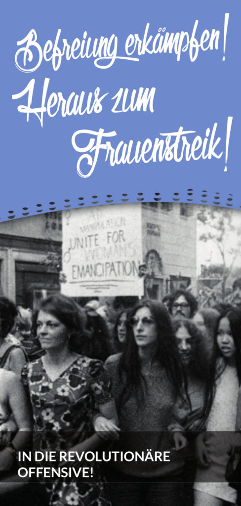 Wir Frauen müssen als unterdrückte Klasse und als unterdrücktes Geschlecht kämpfen! Wir wollen die doppelte Ausbeutung der Frau überwinden: Die Ausbeutung durch Lohnarbeit und die Ausbeutung durch unbezahlte Reproduktionsarbeit im Privaten. Wir wollen eine Gesellschaft, in der die Reproduktionsarbeit vergesellschaftet und damit kollektive Verantwortung ist. Wir wollen eine Gesellschaft, in der bürgerlich-patriarchale Rollenverhältnisse aufgehoben sind. Nur so kann es eine befreite Gesellschaft geben. Die Aufhebung des Patriarchats muss mit dem Kampf gegen die herrschenden Eigentumsverhältnisse verknüpft werden und damit Teil unseres Klassenkampfes sein. Das Patriarchat ist ökonomisch, politisch und ideologisch so eng mit den herrschenden Verhältnissen verknüpft, dass man es nicht einfach herauslösen kann, ohne den Kapitalismus grundlegend in Frage zu stellen.