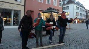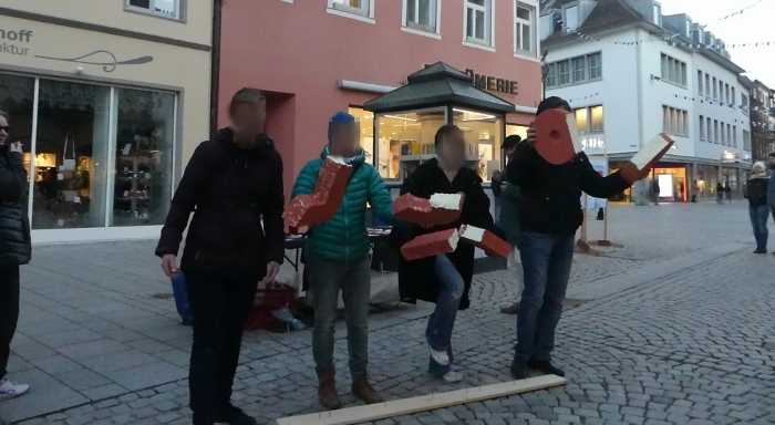 mit Agit-Prop gegen den §218, Stellwänden und gemeinsamem Transpi-Sprühen.