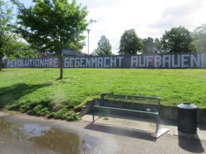 Revolutionäre Demo mit etwa 50 TeilnehmerInnen. Im Anschluss Banner-Aktionen an verschiedenen Ortseingängen und Ausklang mit Pyro und Transparent  an Mobilisierungsgraffiti.