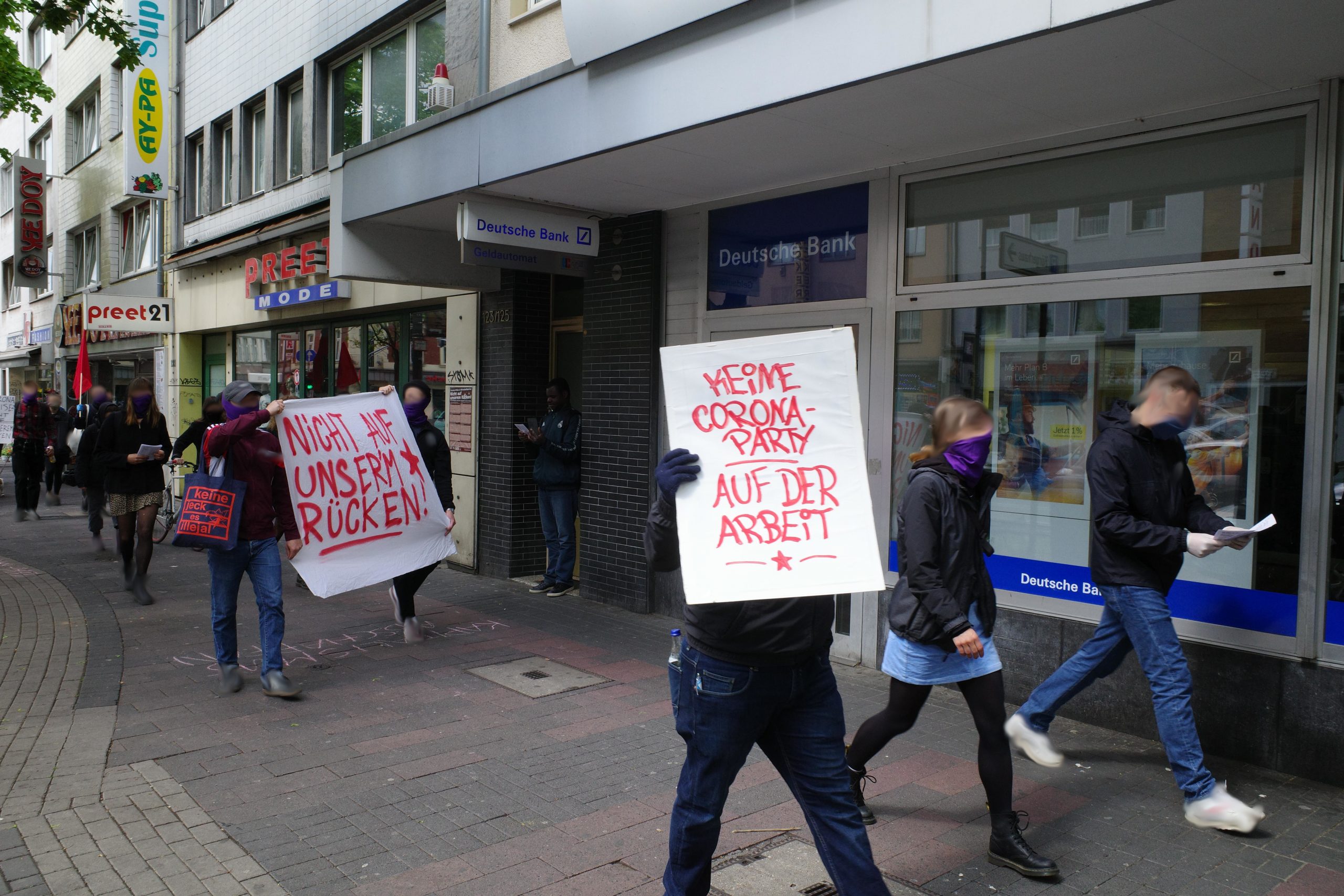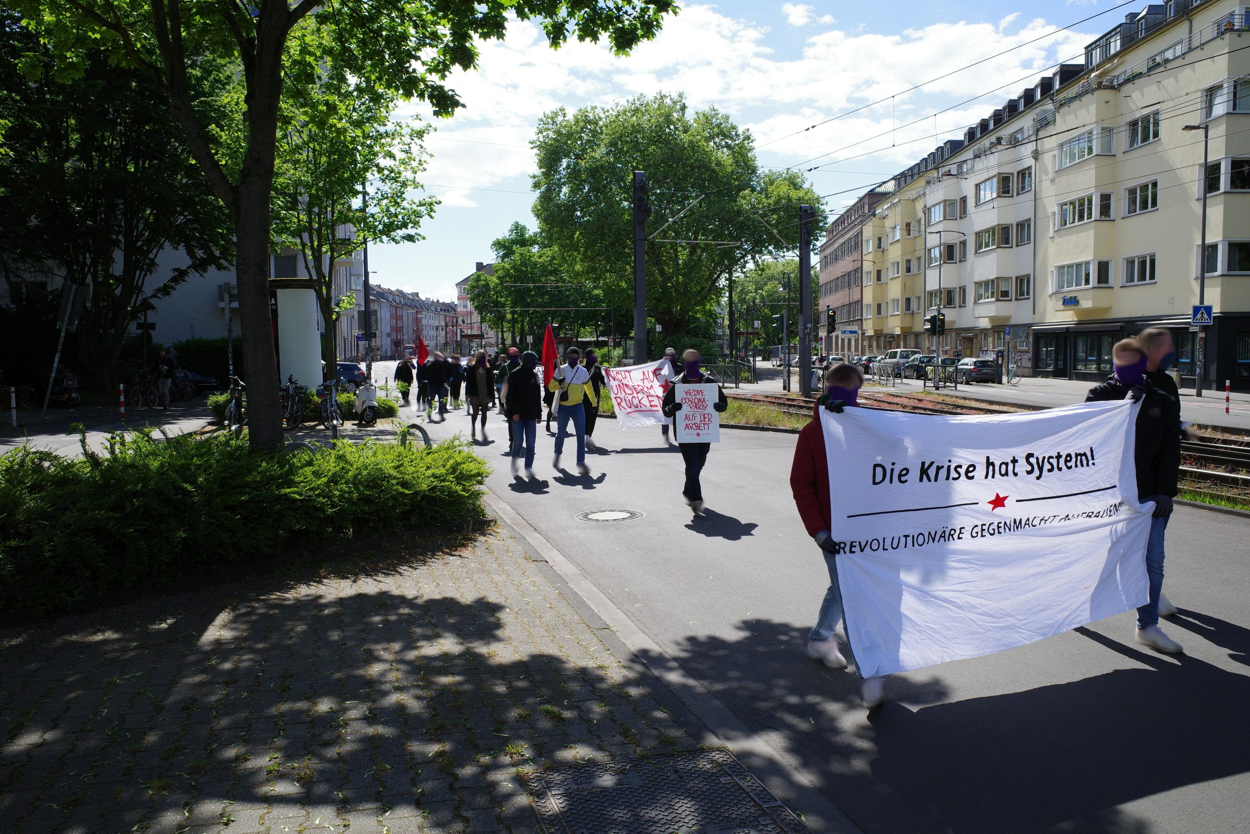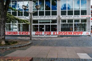 Bei der Erarbeitung von praktischen und organisatorischen Antworten auf die aktuelle Krisensituation, für die es kein bewährtes Muster oder Schema gibt, stoßen wir alle auf neue Probleme und Hürden, die sich nicht auf die Schnelle lösen lassen. Das hat sicher bei vielen dafür gesorgt, dass der Widerspruch zwischen Anspruch und Realität der Maimobilisierungen in diesem Jahr weiter auseinandergeklafft ist, als bisher. Wir verstehen das aber als Ansporn für die weitere Arbeit an einem Aufbauprozess, der langfristig angelegt ist und uns sicher noch vor ganz andere Hürden stellen wird. Eine kapitalistische Krise, wie sie sich jetzt vor uns auftürmt, kann immer auch Türöffner und Chance für die Vermittlung und Entwicklung revolutionärer Perspektiven sein, unabhängig davon wie stark oder schwach die revolutionäre Linke bereits aufgestellt ist – vorausgesetzt wir stellen uns den konkreten Herausforderungen. In diesem Sinne möchten wir mit der folgenden Zusammenstellung auf einen 1. Mai zurückblicken, an dem Kreativität, Entschlossenheit und die Bereitschaft für eine Arbeit in der Klasse und mit der Klasse in vielen Städten und in unterschiedlichen Formen sichtbar wurden: