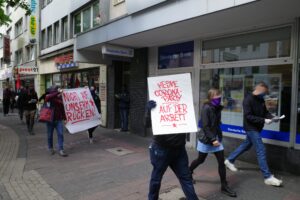 Am Vormittag Aktion gegen das Geschäft mit Wohnraum und Gentrifizierung mit Sprühparolen, Schildern und Transparenten. Im Anschluss antikapitalistische Bündnis-Kundgebung mit über 250 TeilnehmerInnen. Danach Schilder-Aktion an CDU-Büro gegen ihre Klimapolitik und die weitere Verschlechterung der Arbeitsbedingungen von Pflege-Beschäftigten unter ihrer Führung.
