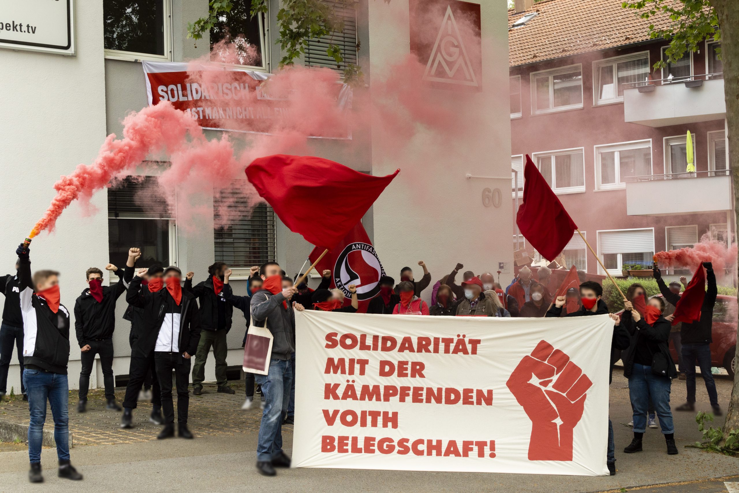 Antikapitalistische Bündnisdemo mit 100 TeilnehmerInnen. Im Demoverlauf: Symbolische Absperraktion an der Niederlassung des Arbeitsgeberverbands „Südwestmetall“, Plakatieraktion an Grünen-Parteibüro. Im Anschluss: Solibild mit Pyro für die streikende Belegschaft beim Maschinenbauer Voith in Sonthofen.