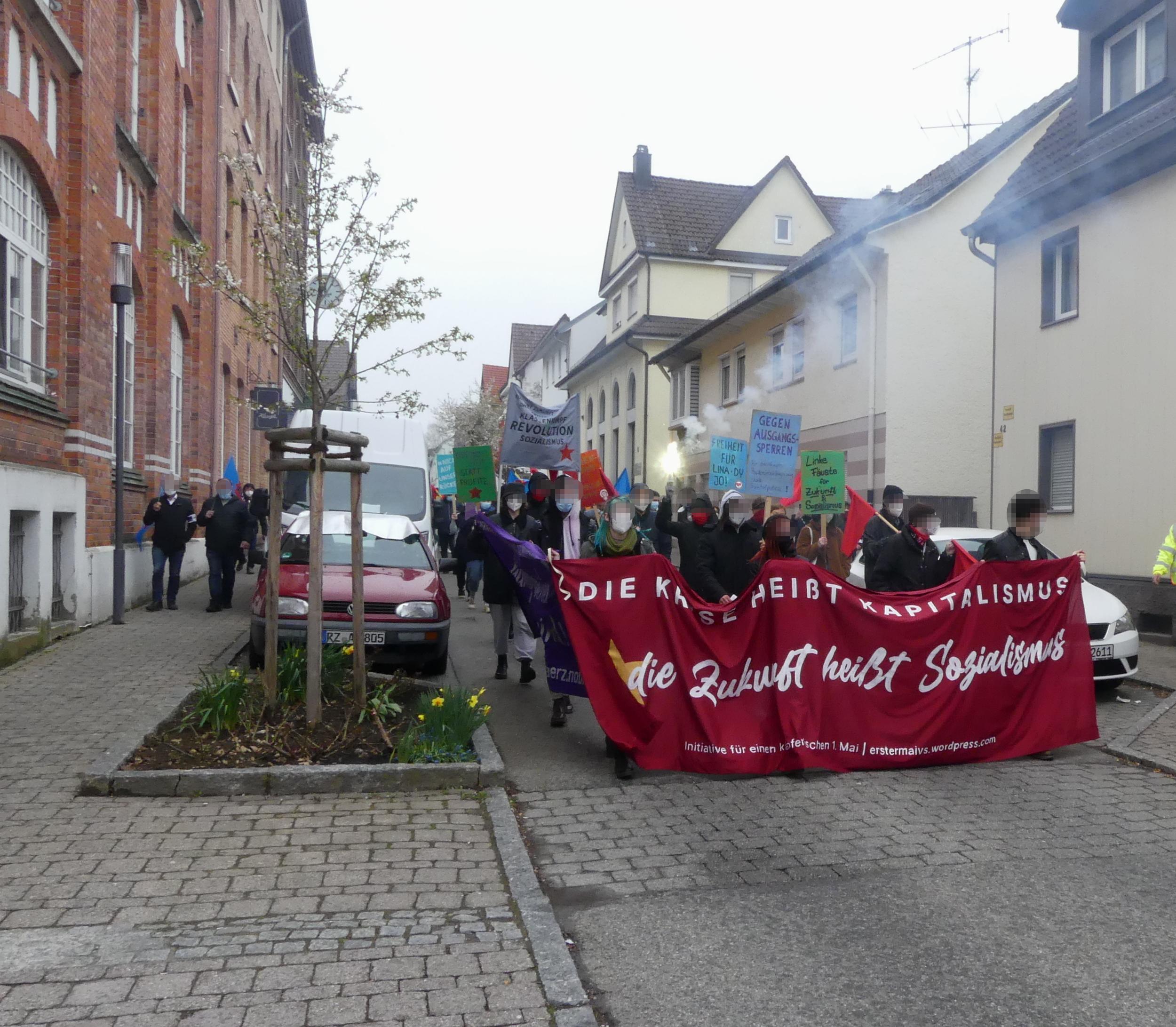 Mit einem lautstarken und kämpferischen revolutionären Frontblock zog die Demonstration durch die Waiblinger Innenstadt, mit verschiedenen Aktionen wurde etwa gegen die herrschende Corona Politik Stellung bezogen und an einer, wegen des „Freizeitlockdowns“ abgesperrten Treppe für eine tatsächliche Pandemiebekämpfung geworben. Es ist offensichtlich, dass die Bundes- und Landesregierungen den Profit der Großkonzerne über Menschenleben stellen und gleichzeitig die Arbeiter:innen in der Gastronomie, dem Kulturbereich oder im Einzelhandel im Regen stehen gelassen werden. Weiter ging es dann vorbei an der Filiale der Deutschen Bank auf deren Fassade Hammer und Sichel und Krisenprofiteure angreifen zu sehen war. Dazu gab es noch Roten Rauch und vor dem Amtsgericht eine Aktion in Solidarität mit linken und revolutionären Kräften und den kriminalisierten Antifaschist:innen Dy, Jo und Lina. Den Abschluss der Demonstration bildete eine verdeckt gehaltene revolutionäre Rede von Kommunist:innen aus dem Rems-Murr-Kreis.