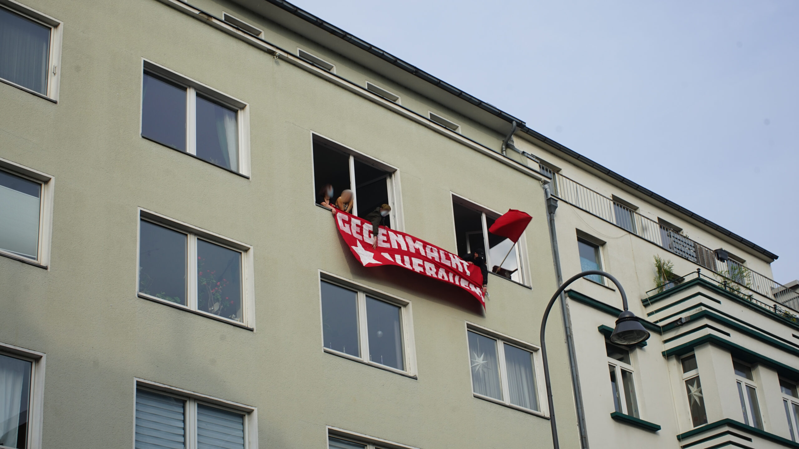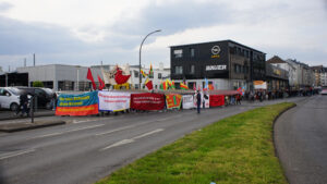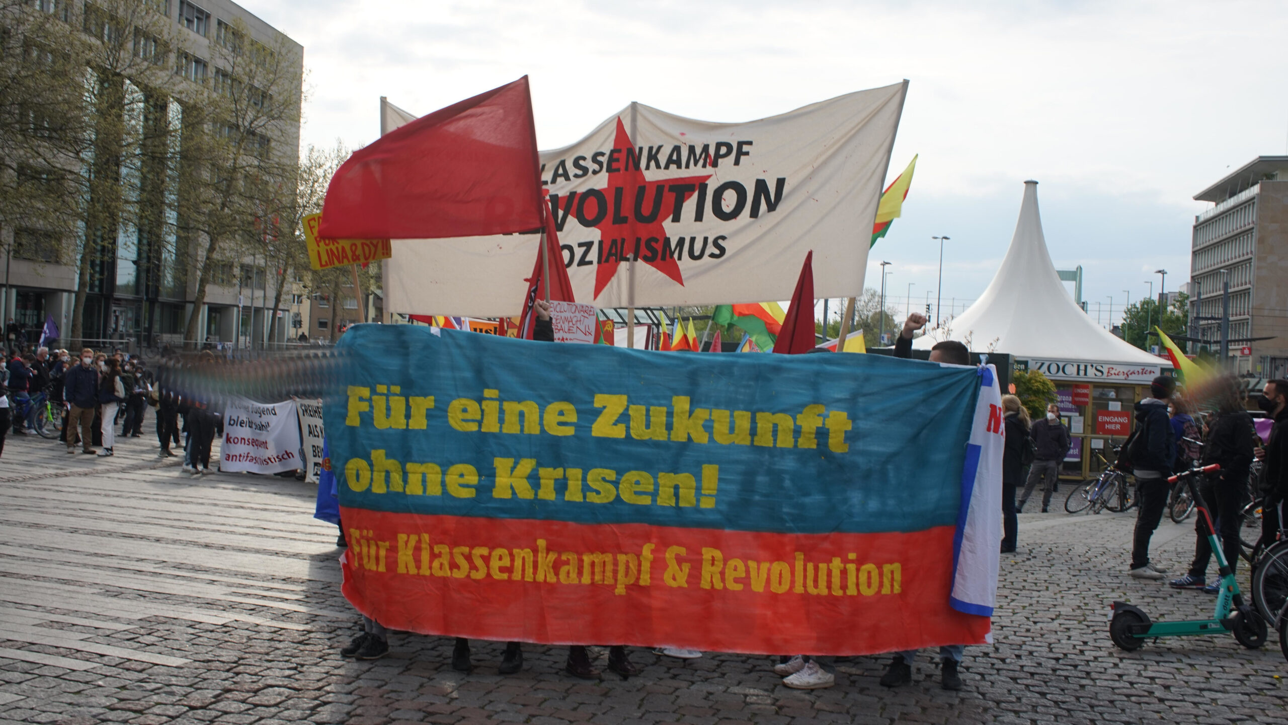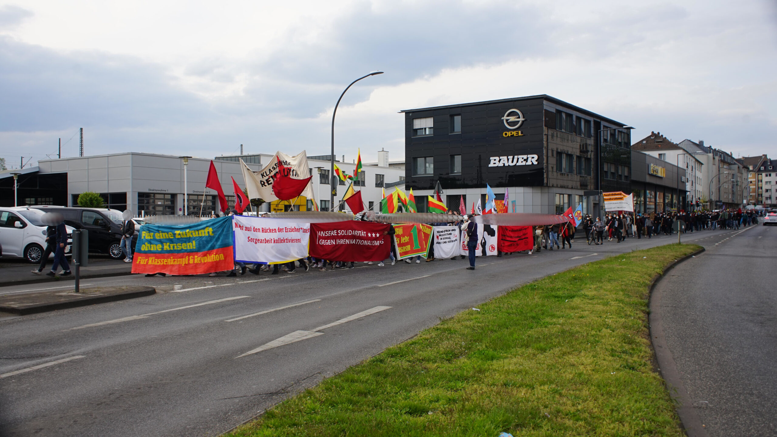 Schon morgens um 8 Uhr startete eine militante Spontandemonstration durch Köln-Sülz. Wenig später begann die erste angemeldete Demonstration des Tages, organisiert von einem breiten Bündnis kommunistischer Organisationen. Im Verlauf der Demo wurde der Block der kurdischen Genoss:innen von der Polizei angegriffen, einige von ihnen und auch solidarische Teilnehmer:innen wurden verhaftet und für einige Zeit im Knast festgehalten. Wir sind solidarisch mit allen von Repression Betroffenen. Auf der Kundgebung der Gewerkschaften wurden zahlreiche Flyer für ein linkes Zentrum verteilt und Kontakte geknüpft. Schließlich startete um 17:00 die klassenkämpferisch revolutionäre Demonstration. An der Auftaktkundgebung haben ungefähr 450 Menschen teilgenommen, bei der Abschlusskundgebung war die Demonstration auf 600 bis 700 Teilnehmer:innen angewachsen.