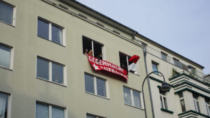 Die Demonstration wurde an vielen Stellen mit vielfältigen Aktionen bereichert: Tapeten wurden am Krankenhaus (“Guter Pflege steht Profit im Wege”) und in der Straße der Hausbesetzung von 2019, der Dieselstraße 15 (“keine Profite mit der Miete”), aufgehängt. Weitere Aktionen, die in der Vergangenheit entlang der Route gelaufen sind, wurden thematisiert. Solidarische Anwohner:innen hängten entlang der Route ein Transparent aus dem Fenster: “Gegenmacht aufbauen!”. Die kämpferische Haltung der Demonstration und ihre Feindschaft zum Staat wurde durch den wiederholten Einsatz zahlreicher Rauchtöpfe und Pyrotechnik und einer Auseinandersetzung mit der Polizei unterstrichen. Es wurde klar: Wir kämpfen gegen den Kapitalismus und unsere Praxis wird nicht von den Herrschenden bestimmt. Wir bauen Gegenmacht von unten auf!