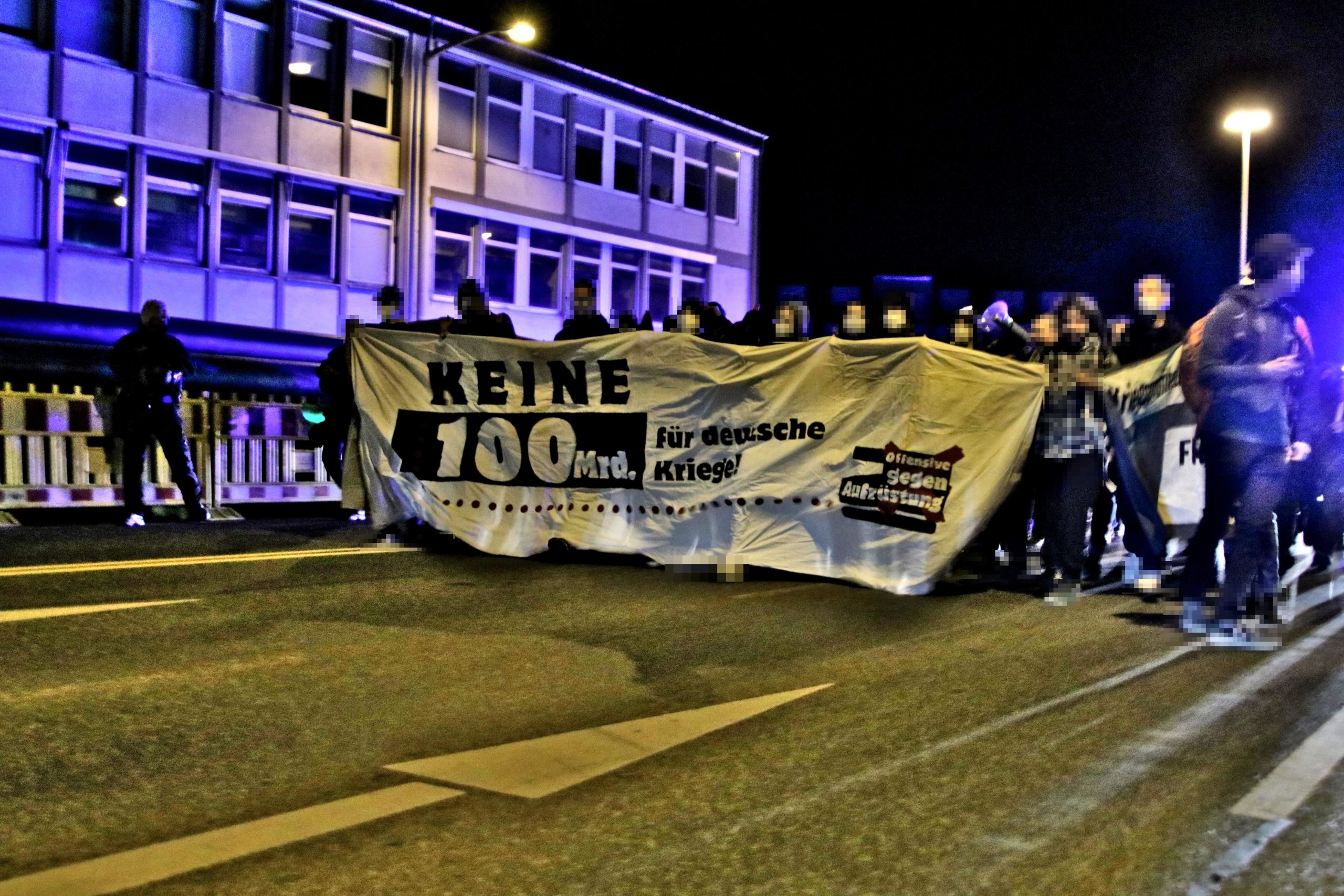 In einem gemeinsamen Redebeitrag der „Offensive gegen Aufrüstung“ wurde darüberhinaus die Notwendigkeit betont in den anstehenden Sozialprotesten auch antimilitaristische Positionen zu vertreten. Es ist eben nicht so, dass es zu wenig „Wohlstand“ in Deutschland gäbe und jetzt alle den Gürtel enger schnallen müssten. Für die Bundeswehr standen beinahe über Nacht 100 Milliarden Euro bereit und während wir kalt Duschen oder uns mit dem Waschlappen putzen sollen, reisen die Bonzen weiter mit ihren Privatjets von der Villa im Nobelviertel zur eigenen Luxusjacht. Unsere Antwort auf Teuerungen und Militarisierung muss deshalb klar antimilitaristisch und klassenkämpferisch sein. In einem weiteren Redebeitrag vor dem am Vortag blockierten KMW Werk ging ein lokaler Gewerkschafter auf die Notwendigkeit antimilitaristischer Gewerkschaftsarbeit ein und stellte klar, dass die Einstellung der Rüstungsproduktion sich nicht gegen die Interessen der Arbeiter:innen bei Rheinmetall richtet. Rheinmetall hat in seiner Geschichte durchaus zivile Produkte produziert, damit ließ sich nur einfach nicht so viel Profit machen, wie mit Waffen. Profit, von dem Arbeiter:innen übrigens wenig sehen, die Rheinmetall Aktionär:innen dafür umso mehr.
