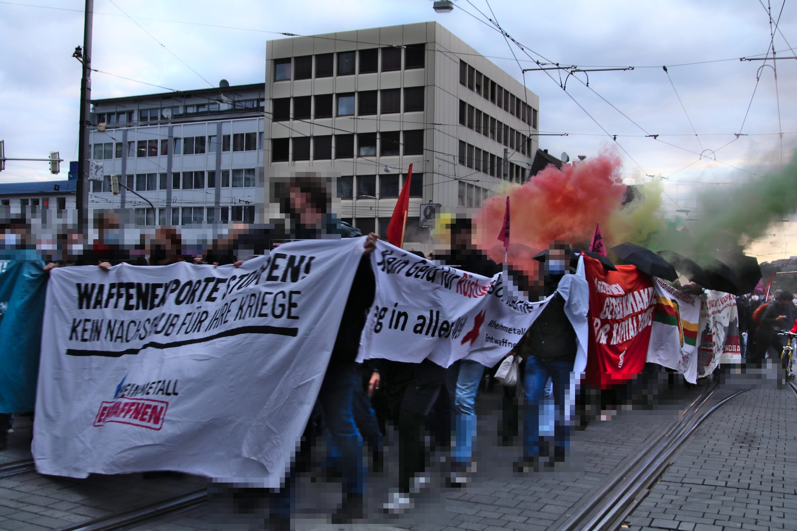 Die solidarische Zusammenarbeit verschiedenster Akteure und Spektren und das gemeinsame Verständnis vom „Hauptfeind im eigenen Land“ sehen wir gerade in Zeiten, in denen diese wichtige Position von vielen in Frage gestellt wird als großen Erfolg der Aktionstage von „Rheinmetall Entwaffnen“ an. Trotz einer kaum vorhandenen Antikriegsbewegung und wenig kontinuierlich arbeitenden antimilitaristischen Gruppen in Deutschland waren die Proteste in Kassel möglich und haben mit der Blockade am Freitag morgen den symbolischen Rahmen überschritten. Auch das solidarische Vorgehen gegen die Repression auf der Straße bei den Blockaden am Freitag, bei der Demonstration am Samstag und bei verschiedenen Festnahmeversuchen hat gezeigt, dass die antimilitaristische Bewegung die Kraft hat, sich nicht spalten zu lassen. An diese gegenseitige Solidarität gilt es auch in Zukunft anzuknüpfen.