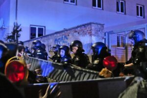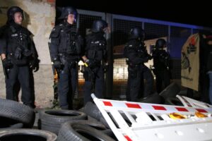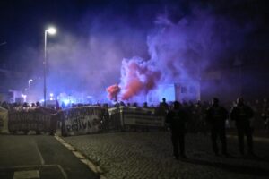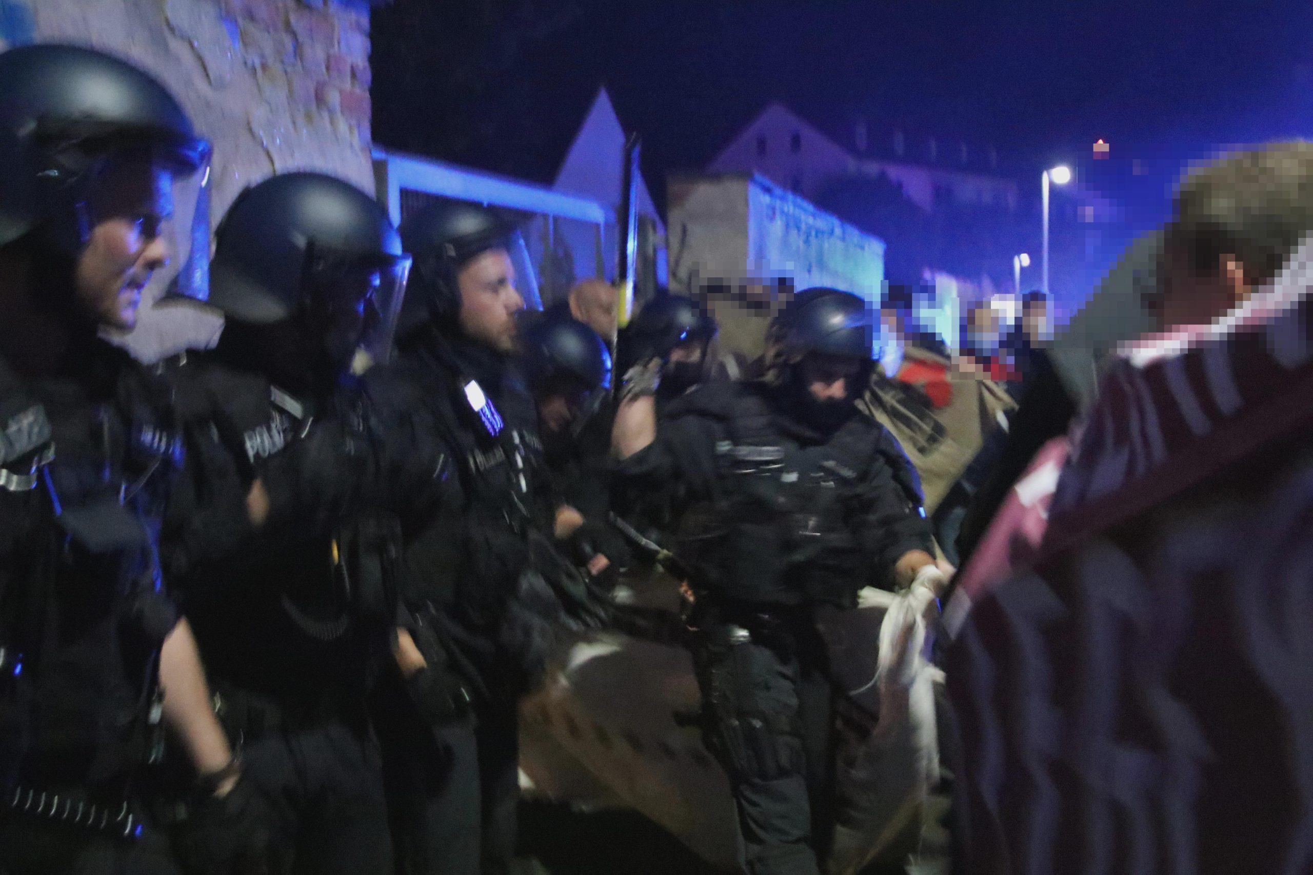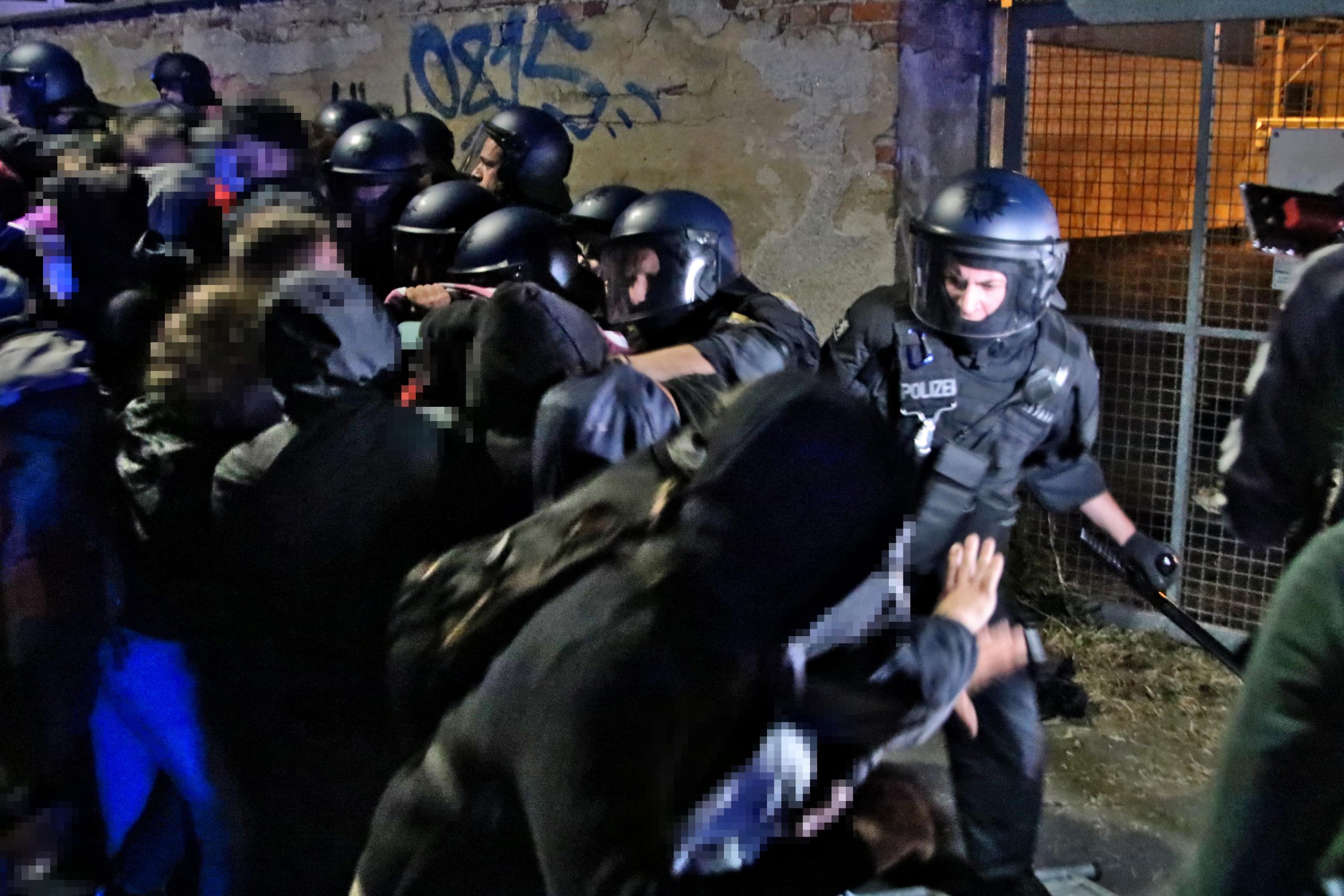 Bei einem Werkstor wurde die Blockade des Tors durch Baustellenmaterial und Autoreifen verstärkt. Nachdem die Bullen das verhindern wollten, entwickelte sich eine längere Auseinandersetzung, während der die Bullen mehrmals zurückgedrängt werden konnten – dabei gelangte dem Vernehmen nach wohl auch ein Bullenhelm in die Hände der Aktivist:innen. Erst nach über 20 Minuten und unter dem literweisen Einsatz von Pfefferspray und massivem Schlagstockeinsatz schafften die Bullen es einen kleinen Korridor zwischen Blockade und Werkstor frei zu prügeln, sodass weitere Kräfte hinzugezogen werden konnten.