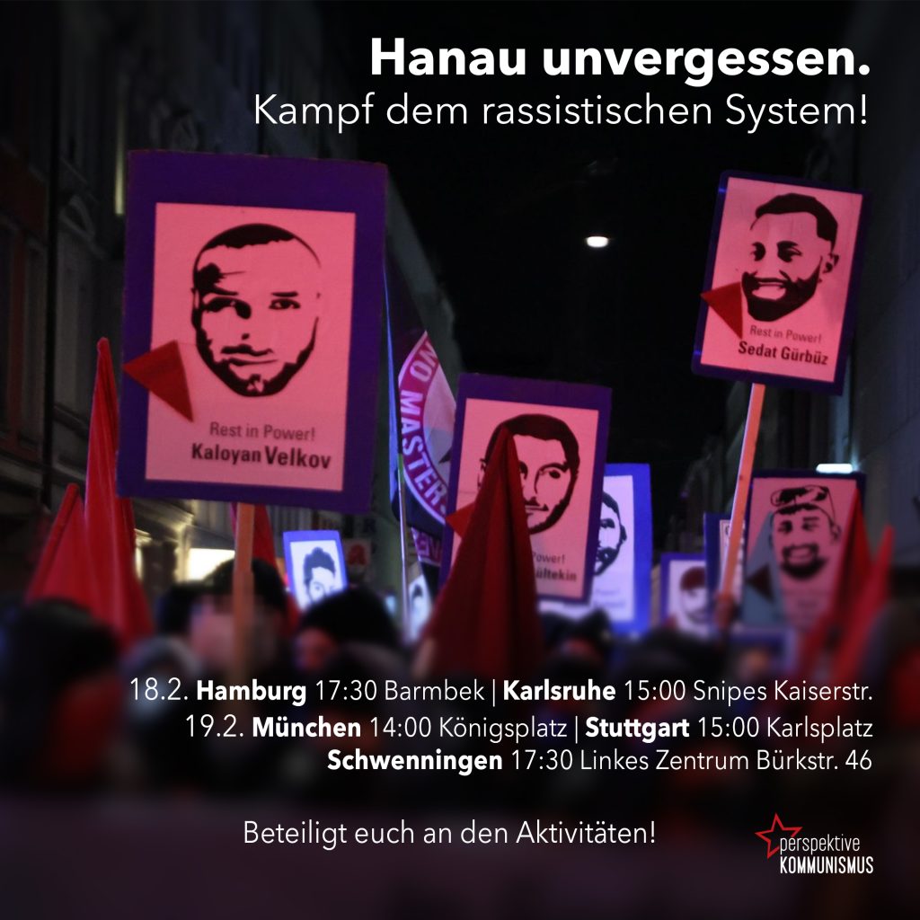 Wir rufen dazu auf zum Jahrestag von Hanau auf die Straße zu gehen. Wir rufen auch dazu auf, zu kämpfen: Dafür, dass die Verhältnisse in diesem Land, welche den Rassismus und die tagtägliche Ausgrenzung, Abwertung und Gewalt, welche den Boden für die Tat in Hanau bilden, endlich der Vergangenheit angehören.