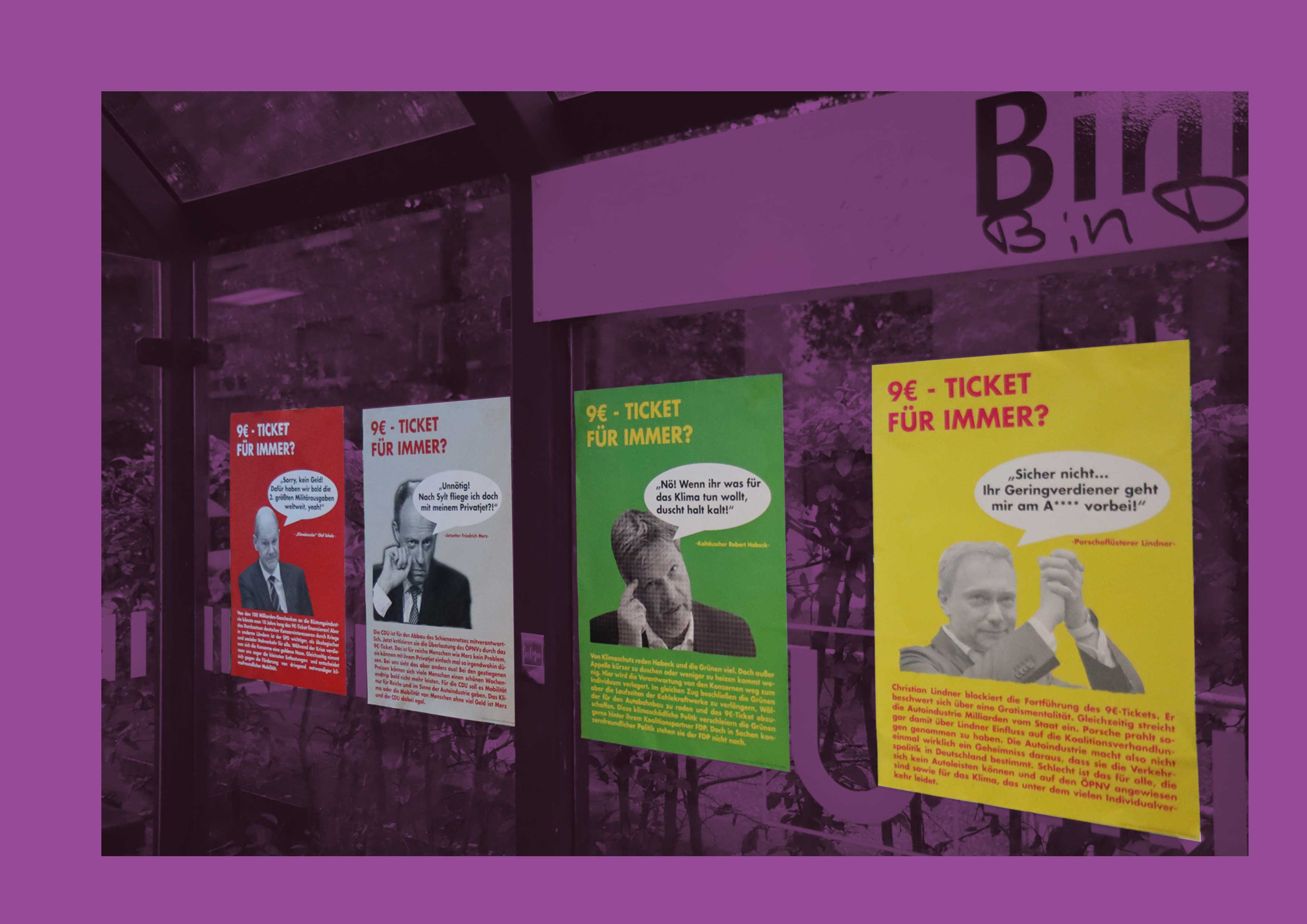 Auch das 9 Euro Ticket, aus dem jetzt ein 49 Euro Ticket werden soll, ist nur eine Scheinlösung. Günstige Tickets für alle sind zwar super und ein Schritt in die richtige Richtung. Sie müssen aber mit zwei, viel wichtigeren Maßnahmen zusammen umgesetzt werden. Erstens muss der Nahverkehr auch dementsprechend ausgebaut werden. Es ergibt keinen Sinn, wenn einfach mehr Menschen Bahn fahren. Es braucht mehr Busse und Bahnen damit mehr Menschen Bahn fahren können. Außerdem müssen die Löhne und Gehälter der Angestellten im lokalen Nahverkehr vollständig von den Einnahmen durch Ticketverkäufe entkoppelt werden. Es ergibt keinen Sinn, jetzt den Geldhahn für den Nahverkehr endgültig zu zudrehen. Es wird aber auch von Seiten der Regierung keine Verkehrswende geben, solange diese in erster Linie Befehlsempfänger der deutschen Autolobby sind. Das Geld wird lieber in Subventionen für Dienstwägen und achtspurige Autobahnen ausgegeben, statt den Busfahrer:innen ein gutes Gehalt zu zahlen. Die Profite der Autokonzerne werden hier mal wieder vor die Interessen der Beschäftigten und ein Abwenden der Klimakatastrophe gestellt. Die Bundesregierung möchte hier nicht auf die Bahn setzen sondern auf das Elektroauto und dafür das Autobahnnetz weiter ausbauen. Das wird ohne Rücksicht auf unsere Wälder oder die folgende CO2-Bilanz zu Gunsten der Autokonzerne weiter durchgesetzt. Elektroautos sind scheiße. Sie sind nicht wesentliche Besser für die Umwelt als Dieselautos und leisten, kann sie sich bei den sinkenden Löhnen eh niemand. Wir brauchen keinen teuren Individualverkehr auf zugestopften Straßen, sondern pünktliche, ausgebaute und kostenlose Busse und Bahnen – auch auf dem Land. Die Politik entwickelt hier aber, gerade in der Klimaaktstrophe, keine Lösungen. Sie verhindert aktiv, das wir vom Individualverkehr als dominierende Art und Weise der Fortbewegung wegkommen. Das Land ist aber fest in der Hand der Autokonzerne, wie Mercedes, VW und BMW. Wir können von Bundesregierung und Wirtschaft also keine Lösung erwarten.