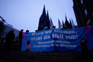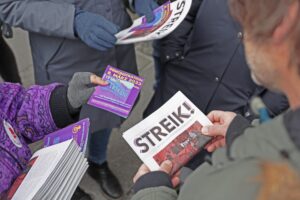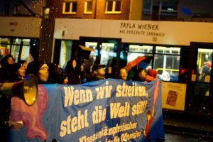 2000 Streikende im Sozial- und Erziehungsdienst für höhere Löhne +++ Besuch und Unterstützung von Streikposten +++ 6000 Menschen auf klassenkämpferischer und internationalistischer Demo unter dem Motto „Die Krise heißt Kapitalismus. Feministisch streiken weltweit!“ +++ Feuerwerk, Konfetti, Plakataktionen und Denkmalumwidmungen