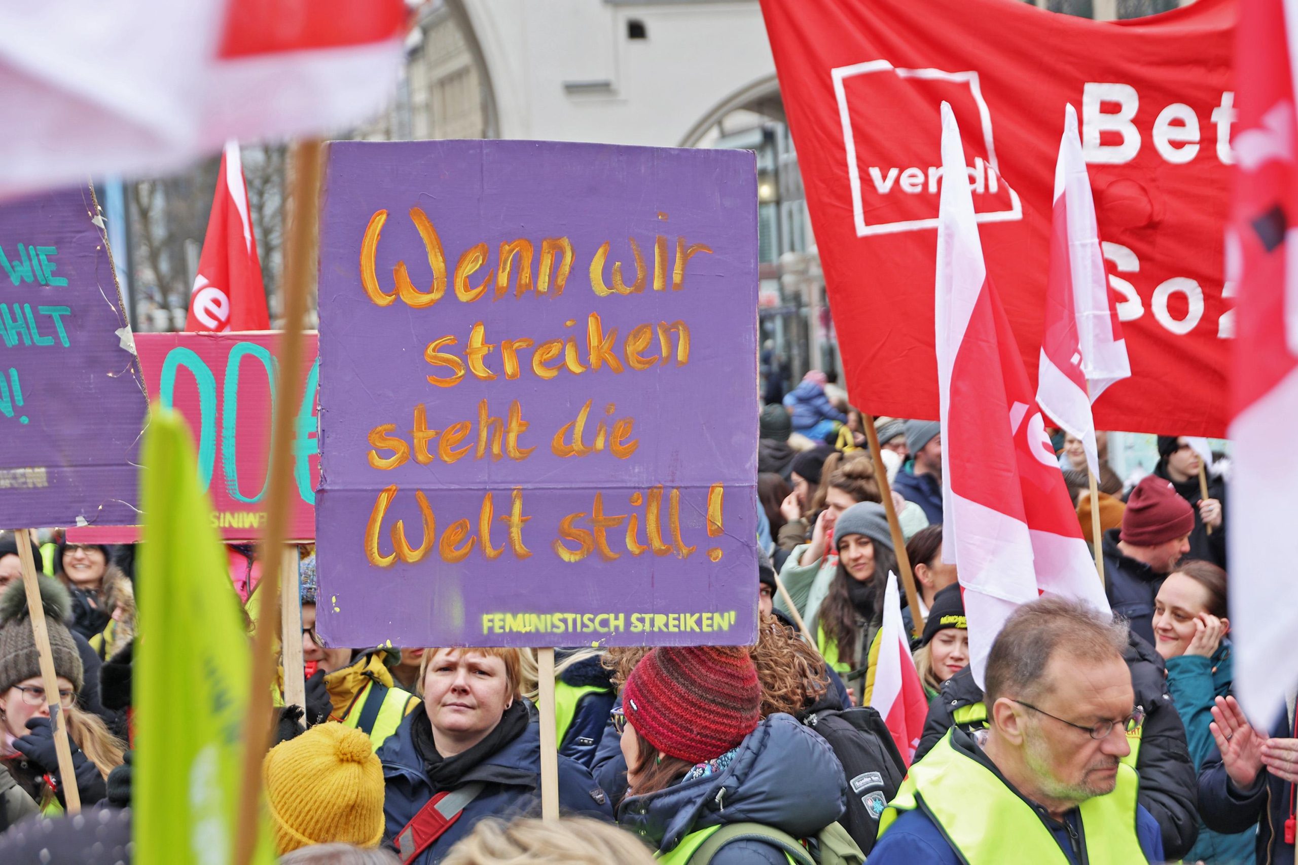 2000 Streikende im Sozial- und Erziehungsdienst für höhere Löhne +++ Besuch und Unterstützung von Streikposten +++ 6000 Menschen auf klassenkämpferischer und internationalistischer Demo unter dem Motto „Die Krise heißt Kapitalismus. Feministisch streiken weltweit!“ +++ Feuerwerk, Konfetti, Plakataktionen und Denkmalumwidmungen