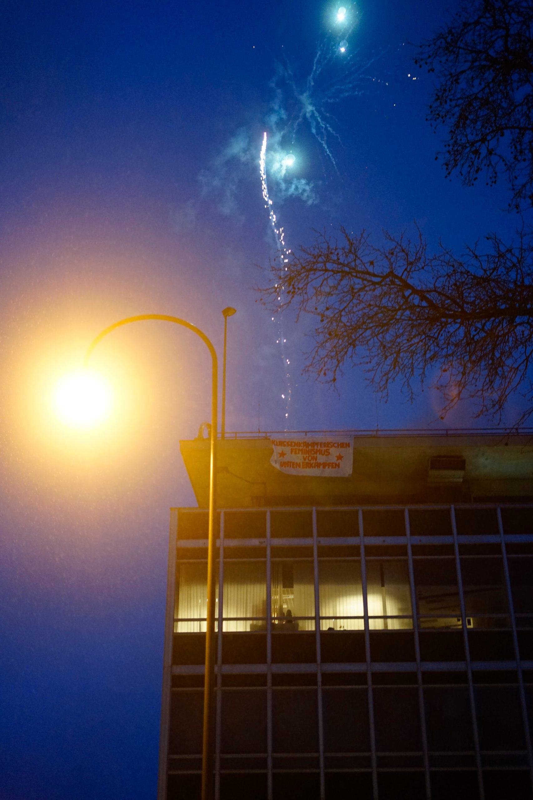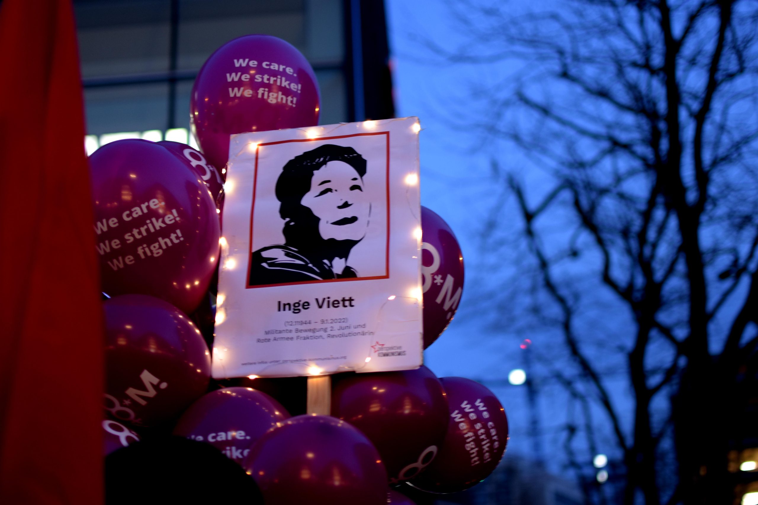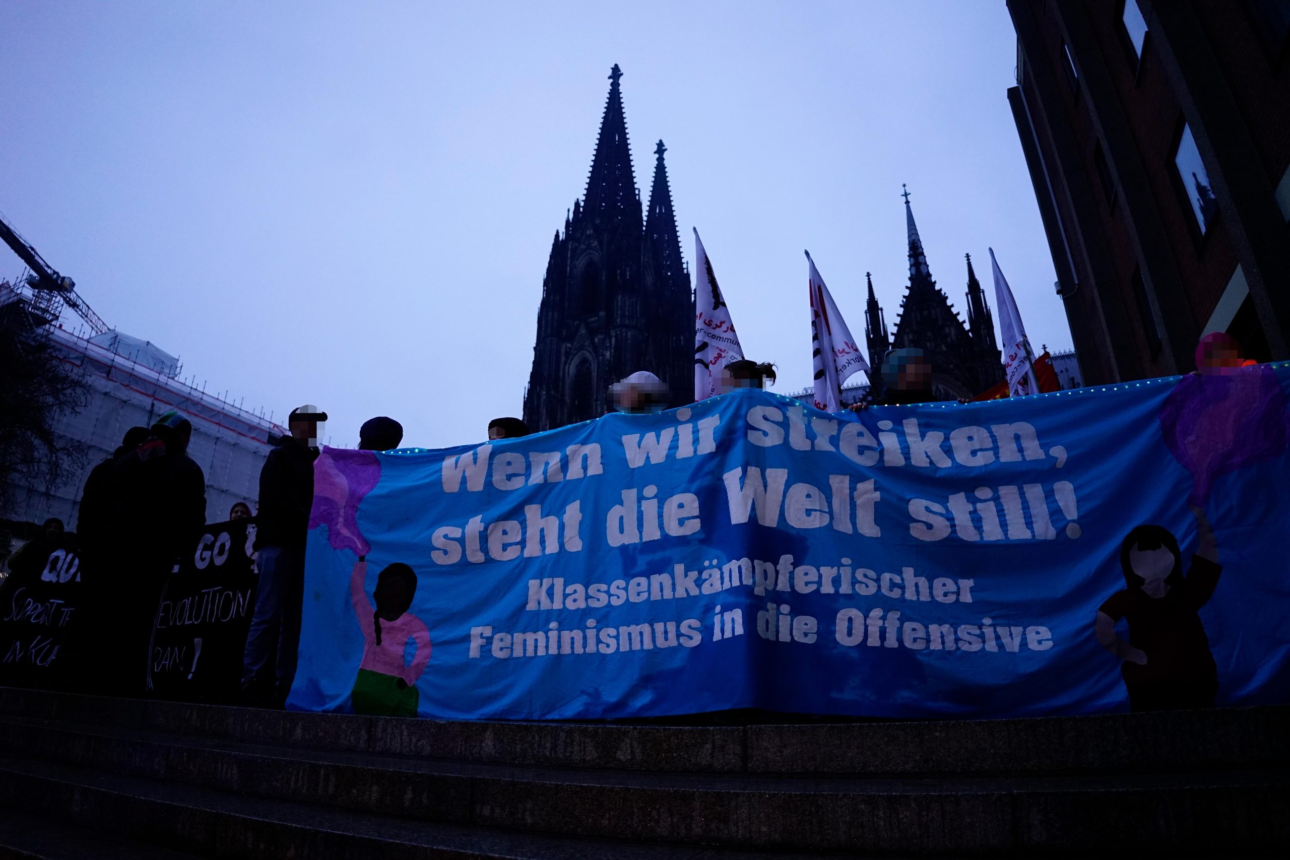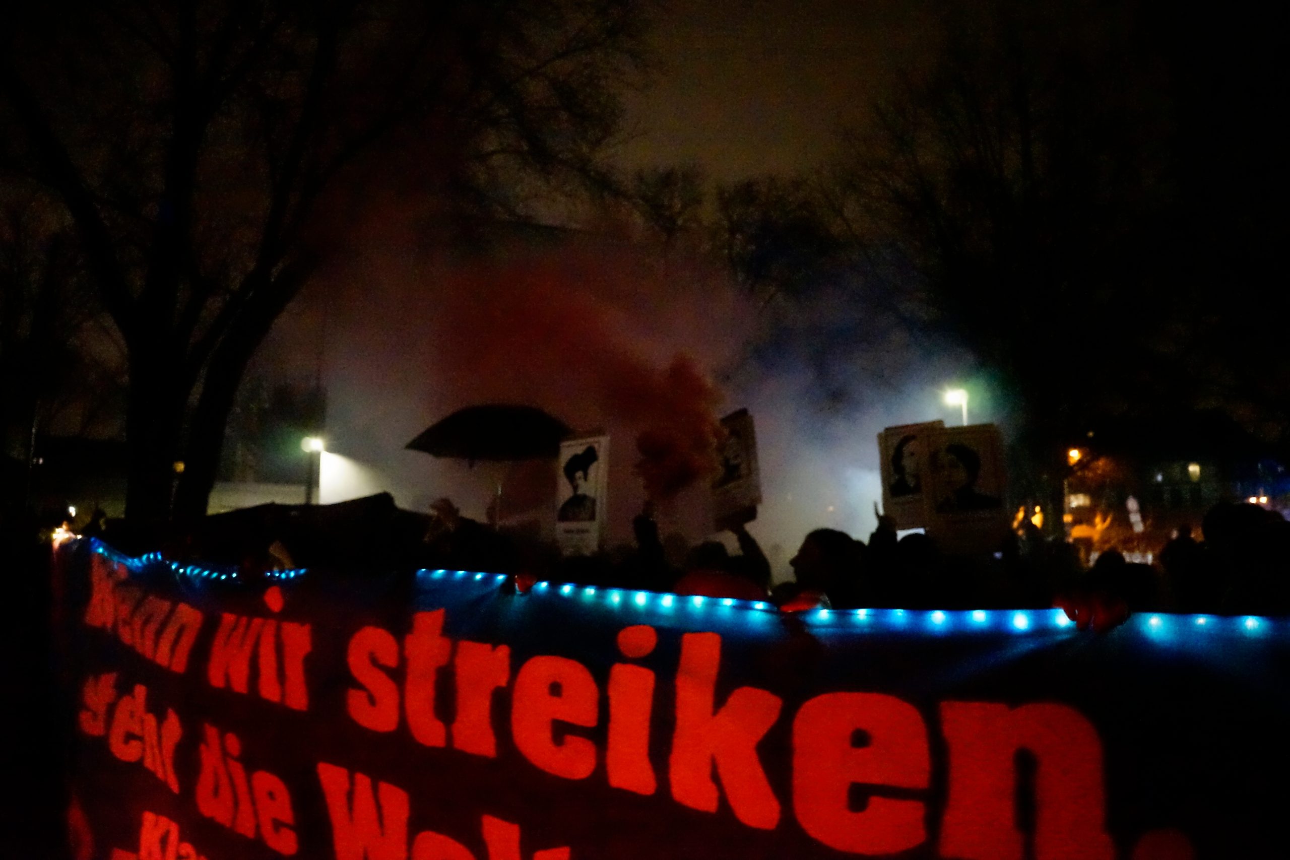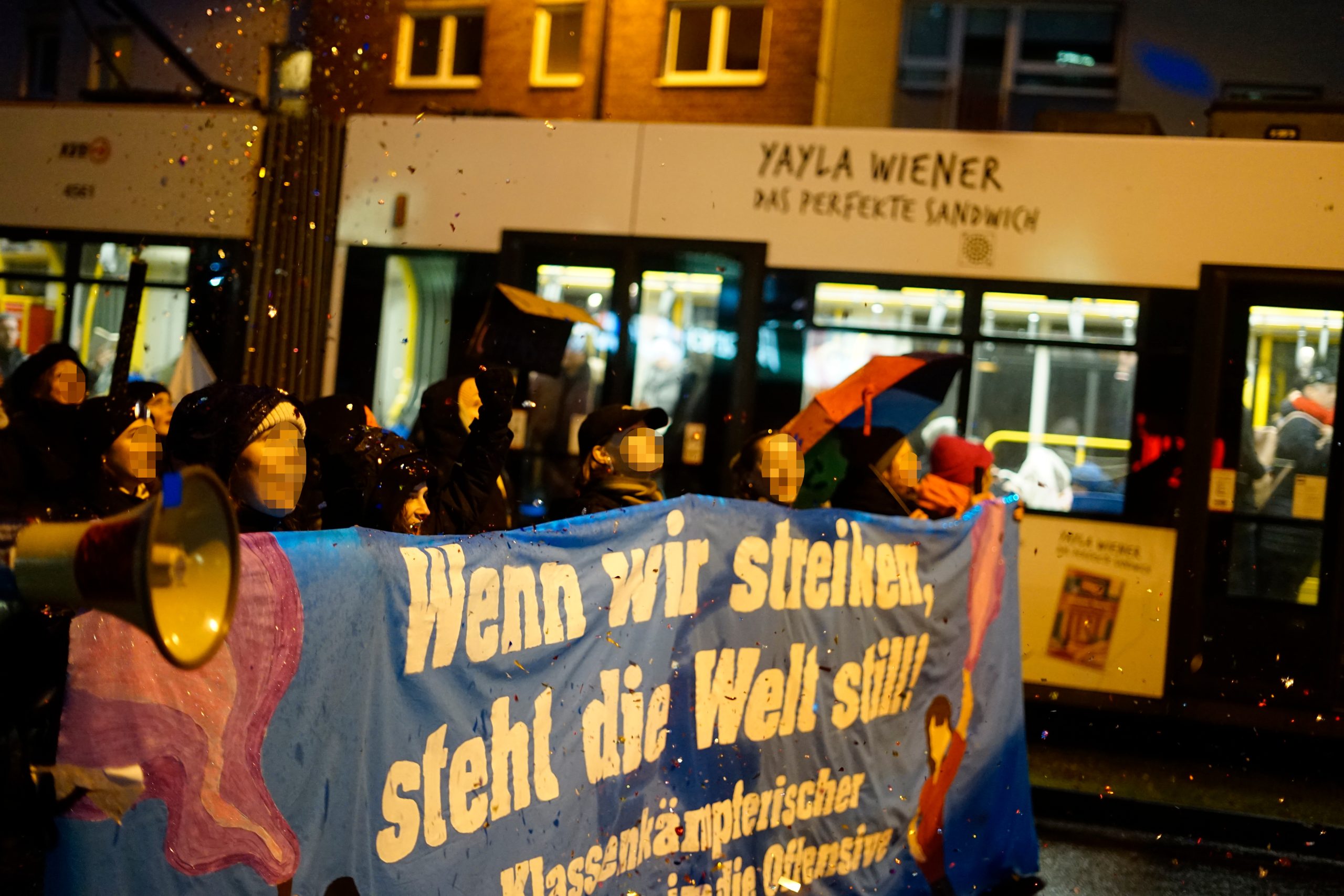 Soli-Foto für die Streikenden +++ Demo unter dem Motto „Die Krise steckt im System! Feministisch kämpfen – weltweit!“ mit 150 Teilnehmer:innen +++ Feuerwerk und Banner Aktion