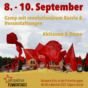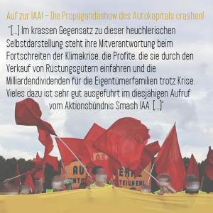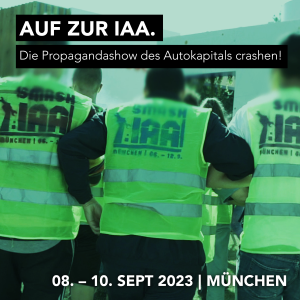 Dieses Jahr findet im September erneut die Internationale Automobilausstellung (IAA) in München statt. Diese Messe ist in erster Linie eine Propagandaveranstaltung des Autokapitals, einer der mächtigsten Industrien in Deutschland, die um ihre Vormachtstellung kämpft.Die Hochglanzmesse mit grünem Anstrich und „offenem“ Anspruch täuscht vor: ihre Industrie sei sozial und umweltfreundlich. Im krassen Gegensatz zu dieser heuchlerischen Selbstdarstellung steht ihre Mitverantwortung beim Fortschreiten der Klimakrise, die Profite, die sie durch den Verkauf von Rüstungsgütern einfahren und die Milliardendividenden für die Eigentümerfamilien trotz Krise. Vieles dazu ist sehr gut ausgeführt im diesjähigen Aufruf vom Aktionsbündnis Smash IAA.