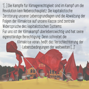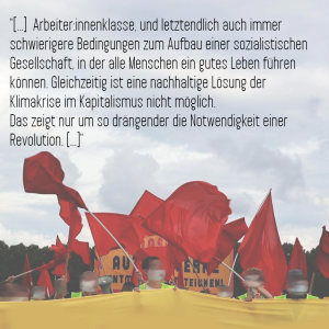 Die Kämpfe für Klimagerechtigkeit sind im Kampf um die Revolution kein Nebenschauplatz. Die kapitalistische Zerstörung unserer Lebensgrundlagen und die Abwälzung der Folgen der Klimakrise auf unsere Klasse sind zentrale Widersprüche des kapitalistischen Systems. Für uns ist der Klimakampf überlebenswichtig und hat seine eigenständige Berechtigung: Denn schreitet die Klimakrise voran, heißt das Verschlechterung der Lebensbedingungen der weltweiten Arbeiter:innenklasse, und letztendlich auch immer schwierigere Bedingungen zum Aufbau einer sozialistischen Gesellschaft, in der alle Menschen ein gutes Leben führen können. Gleichzeitig ist eine nachhaltige Lösung der Klimakrise im Kapitalismus nicht möglich. Das zeigt nur um so drängender die Notwendigkeit einer Revolution. Schon jetzt politisiert die Klimakrise unzählige Menschen und lässt sie über Alternativen zu diesem System nachdenken. Es ist möglich, dass die Klimakrise zu einer der zentralen Brüche wird, an dem das herrschende System ins Wanken kommt. Aber nur wenn eine kämpfende Bewegung die Brüche, und zwar im Sinne des Interesses der Arbeiter:innenklasse. Wie klassenkämpferischer Klimaaktivismus aussehen kann und was es bedeutet, als Revolutionär:innen Teil der Bewegung zu sein, haben wir schon 2021 im Aufruf zur IAA versucht zu umreißen.