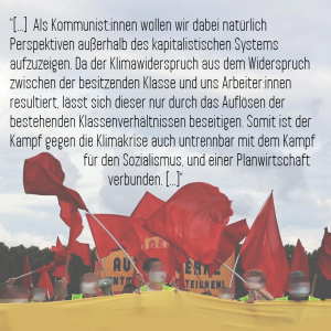 Als Kommunist:innen wollen wir dabei natürlich Perspektiven außerhalb des kapitalistischen Systems aufzuzeigen. Da der Klimawiderspruch aus dem Widerspruch zwischen der besitzenden Klasse und uns Arbeiter:innen resultiert, lässt sich dieser nur durch das Auflösen der bestehenden Klassenverhältnissen beseitigen. Somit ist der Kampf gegen die Klimakrise auch untrennbar mit dem Kampf für den Sozialismus, und einer Planwirtschaft verbunden.
