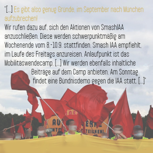 Wir rufen dazu auf, sich den Aktionen von SmashIAA anzuschließen. Diese werden schwerpunktmäßig am Wochenende vom 8.-10.9. stattfinden. Smash IAA empfiehlt, im Laufe des Freitags anzureisen. Anlaufpunkt ist das Mobilitäswendecamp, das schon ab dem 5.9. diverse spannende Veranstaltungen und Möglichkeiten zum Austausch bietet. Wir werden ebenfalls inhaltliche Beiträge auf dem Camp anbieten.