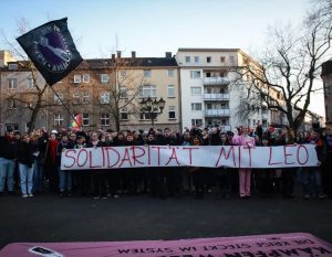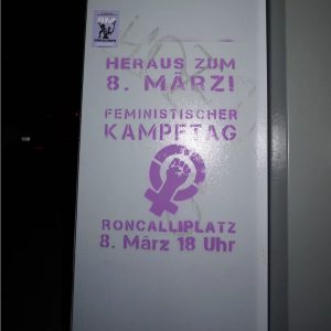 Rund 8000 Menschen beteiligten sich am feministischen Kampftag in Köln. Die Demonstration zog mit kämpferischer Stimmung durch die Innenstadt. Mit einer Schweigeminute und Konterfeis wurde verstorbenen Revolutionärinnen gedacht. Mit einer Durchsage, PKK Fahne und Pyrotechnik in grün, gelb und rot gab eine Solidaritätsaktion mit dem kurdischen Befreiungskampf und gegen die Kriminalisierung der PKK in Deutschland. Am Gewerkschaftshaus wurde eine Tapete mit der Forderung nach einem politischen Streik aufgehangen und ein Bannerdrop am Rande rief zur Teilnahme am Gegenprotest gegen den rechten „Frauenkongress“ auf, welcher ein Tag später in Köln stattfand. Am 9. März zogen dutzende Genoss:innen vor die Burschenschaft Germania in Köln und die Burschenschaft Raczeks in Bonn um die Rechten vor ihren Gebäuden zu konfrontieren. Die Burschenschaften sind personell und organisatorisch verzahnt mit der AfD, der Revolte Rheinland (ehemals Identitäre Bewegung) und der faschistischen Frauengruppe Lukreta. Bericht & Fotos: oft_koeln