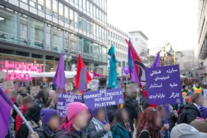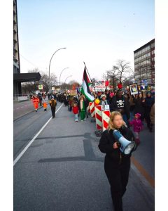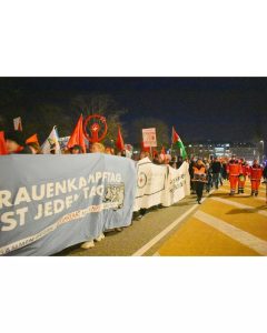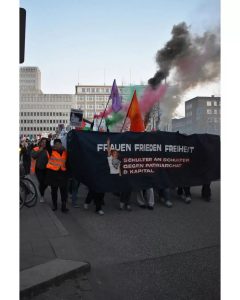 Am 8. März beteiligten sich 700 Teilnehmer:innen unter dem Motto „Frauen, Frieden, Freiheit“ an der Demonstration des Frauenkampfbündnis-Hamburg. Trotz einem hohen Bullenaufgebot konnte eine kämpferische Demonstration durchgeführt werden, mit selbstbestimmter Zwischenkundgebung, einer Rauch-Aktion in den Palästina-Farben und einem Bannerdrop mit Pyro. Es gab Redebeiträge von lateinamerikanischen, palästinensischen und iranischen Genossinnen, ebenso wurde die frauenfeindliche Politik der Bundesregierung thematisiert und auf Repression gegen revolutionäre Frauenorganisierung eingegangen. Bericht & Fotos: frauenbuendnis.hamburg