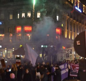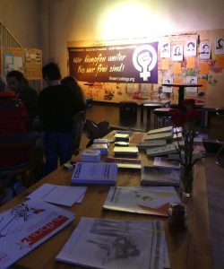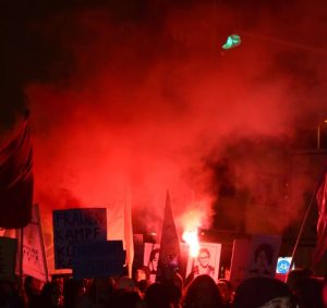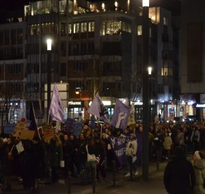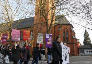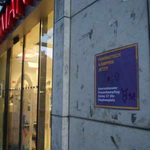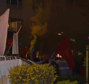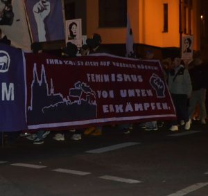 Rund 150 Menschen beteiligten sich an der Frauenkampf Demo am 8. März durch die Duisburger Innenstadt. Neben musikalischer Begleitung der Demo gab es am Rande auch einen Bannerdrop mit der Aufschrift „Feministisch kämpfen – für eine revolutionäre Perspektive“, welches durch Feuerwerk begleitet wurde. Im Internationalistischen Zentrum gab es im Anschluss dann noch eine Filmvorführung mit dem Film „Sufragette“ und solidarisches Beisammensein bei Getränken. Mehr Infos: feminis.duisburg