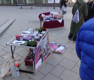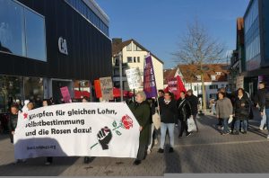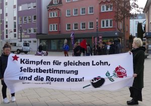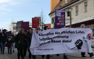 Zum Internationalen Frauentag hat das 8.März-Treffen in Schwenningen zu einer Demonstration in der Innenstadt unter dem Motto „Wir kämpfen für gleichen Lohn, Selbstbestimmung und die Rosen dazu“ aufgerufen. Thematisiert wurde die kapitalistische Krise die mit Aufrüstung und wachsender Kriegsbereitschaft einhergeht und gleichzeitig einer immer massiveren Aushöhlung der öffentlichen Daseinsfürsorge, die vor allem lohnabhängige Frauen trifft.ganz und gar nicht im Sinn. Davon betroffen sind vor allem lohnabhängige Frauen. Mit Plakaten, einem Transparent und kämpferischen Parolen wurde deutlich gemacht Wir Frauen, alle Geschlechter, können nur frei und selbstbestimmt leben, wenn wir gegen dieses kapitalistische und patriarchale System kämpfen. Bericht & Fotos: 8. März Treffen