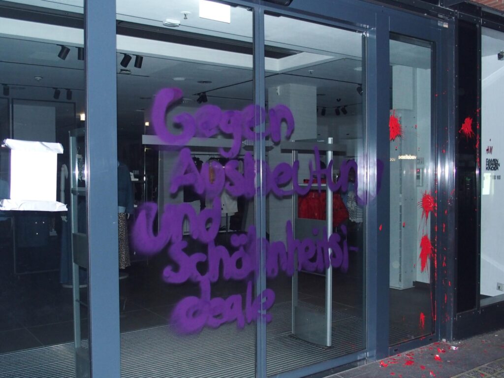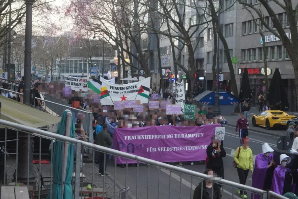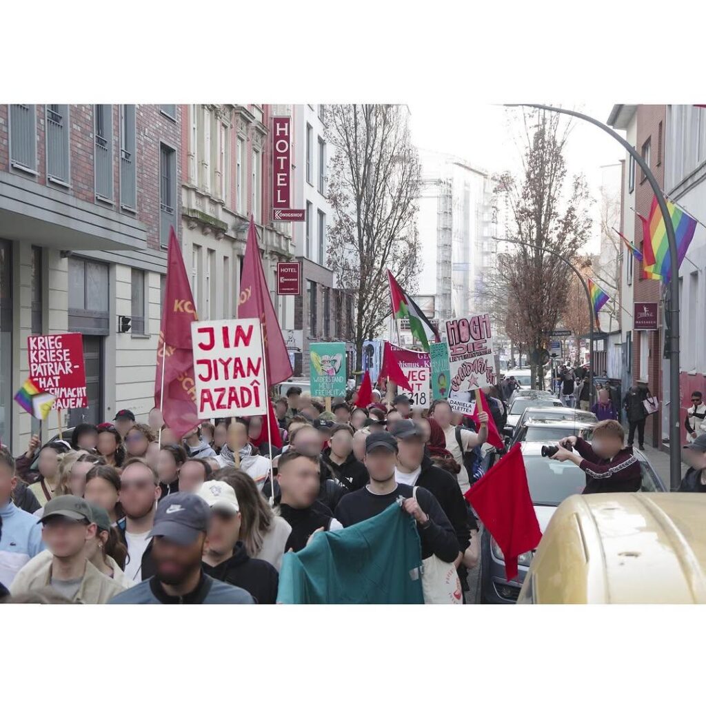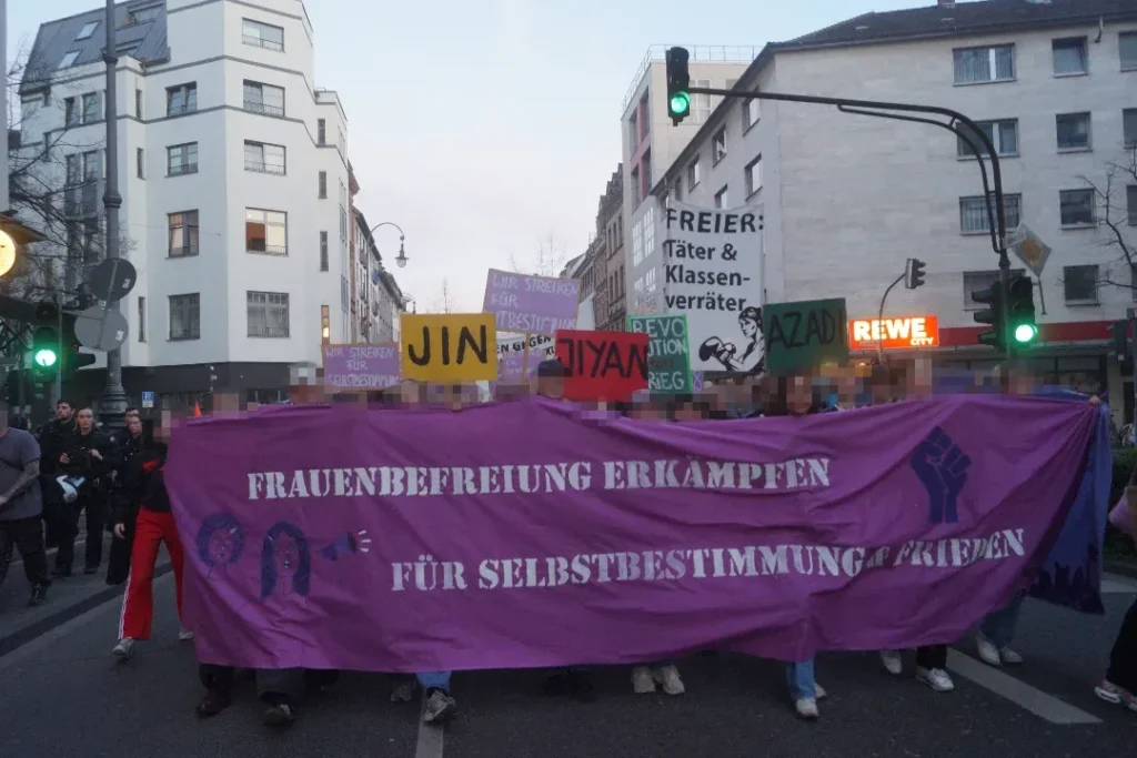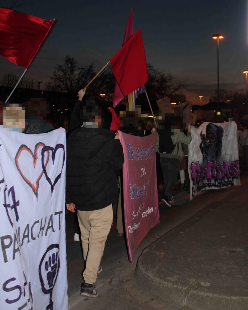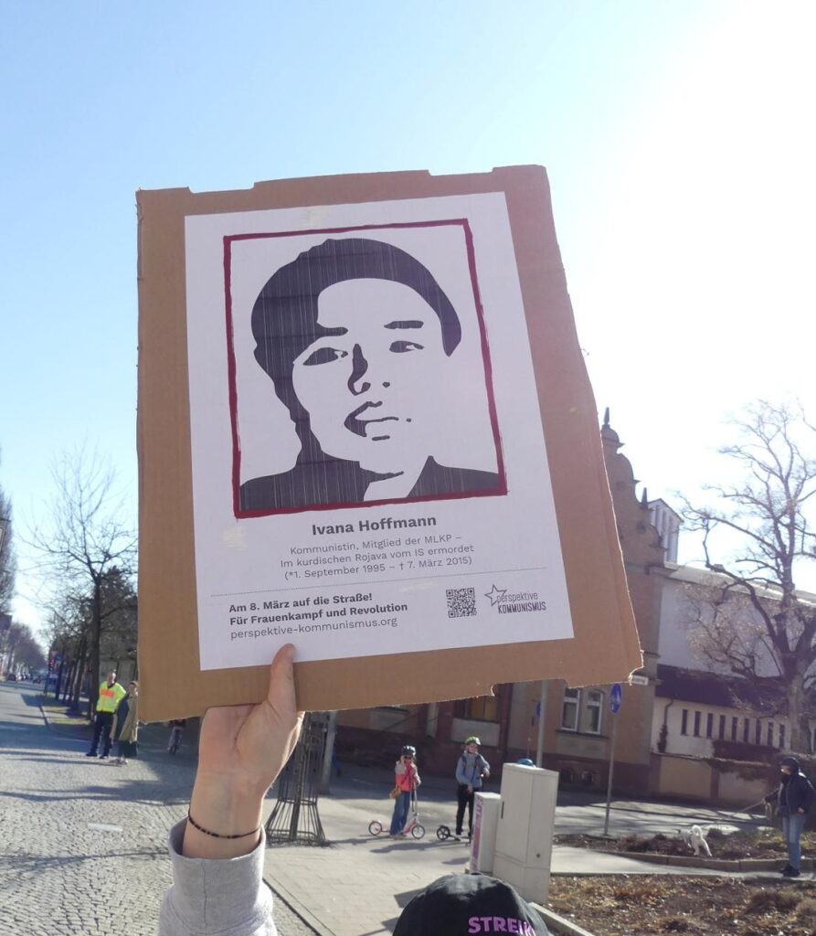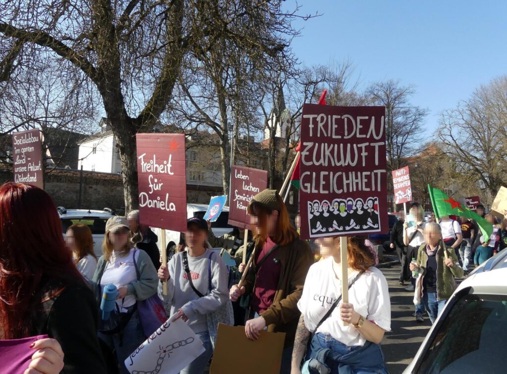 Kämpferisch, mit einer klaren antipatriarchalen, internationalistischen und antikapitalistischen Perspektive für Frauen*bebefreiung, mit der Fahne der Frauenselbstverteidigungseinheiten in Rojava, dem Gedenken an die Genossin Ivana Hoffmann, die am 7.März vor zehn Jahren im Kampf gegen den IS fiel, mit Palästinafahnen und unserer Haltung gegen den genozidalen Krieg gegen die Frauen in Gaza, die Vertreibungen im Westjordanland haben Kommunist:innen Position bezogen. Mit auf der Straße war die Solidarität mit Daniela Klette. Deutlich kam dabei zum Ausdruck, ohne Frauen gibt es keine Revolution und Solidarität sprengt jede Kette. Die Bilder von den Soli-Aktionen in verschiedenen Städten im Vorfeld des 8.März, die wir gefunden haben (Quelle: de.indymedia.org), sind extra zusammengestellt.