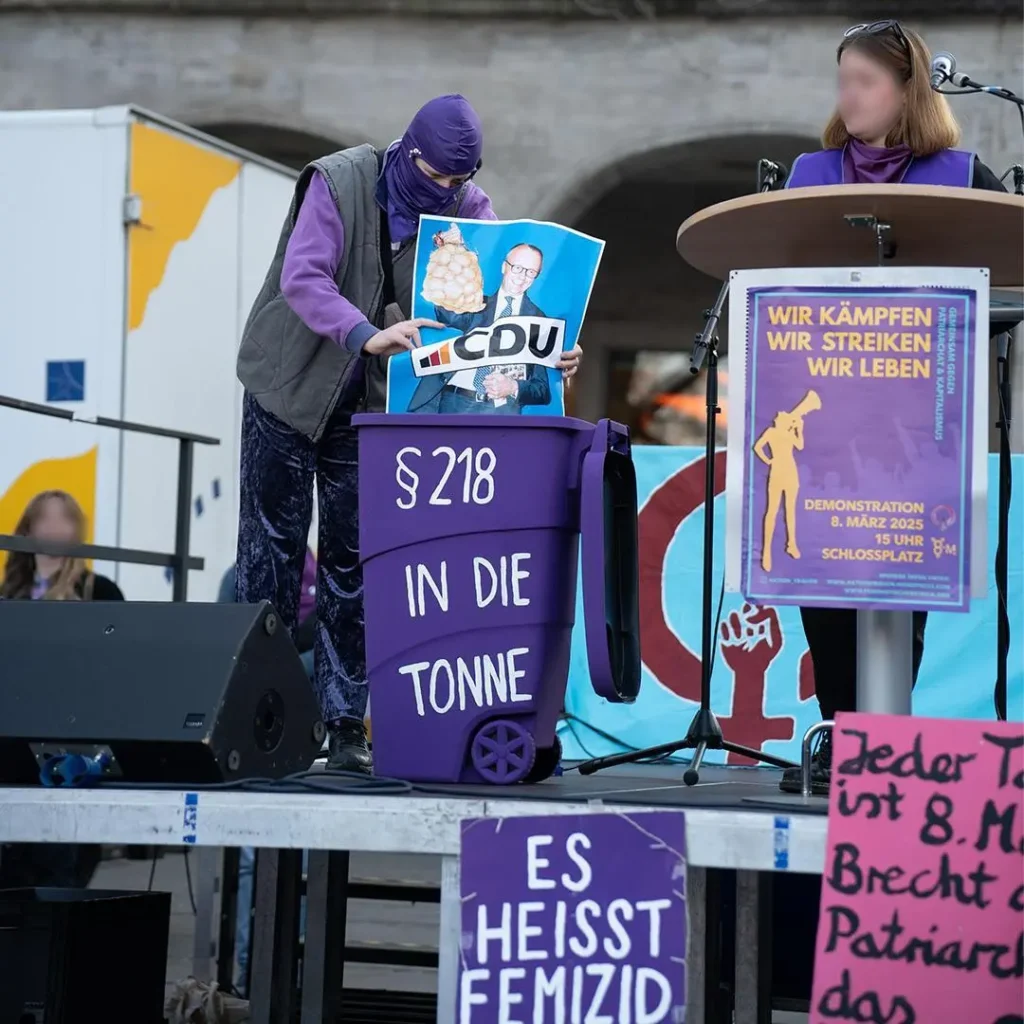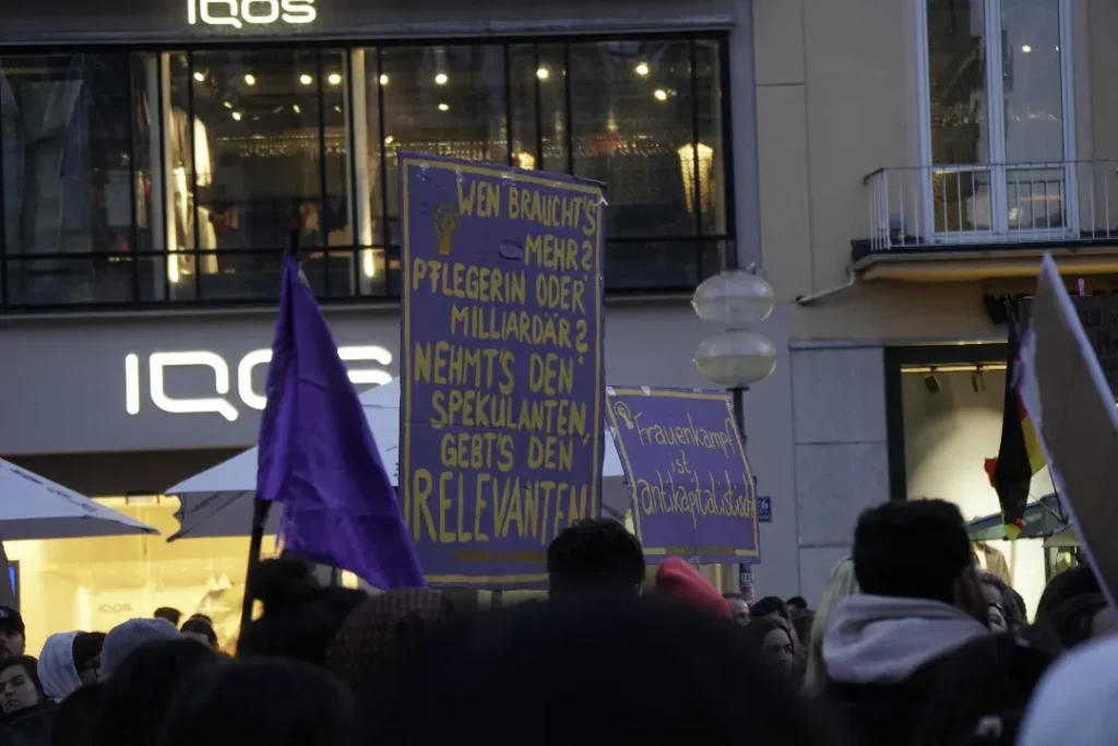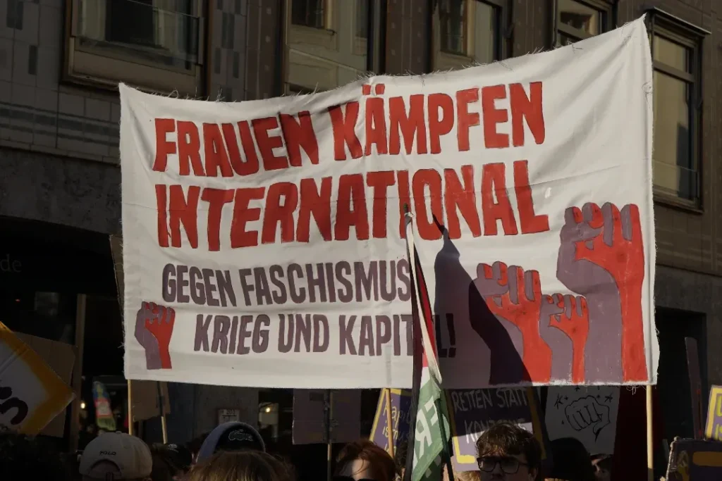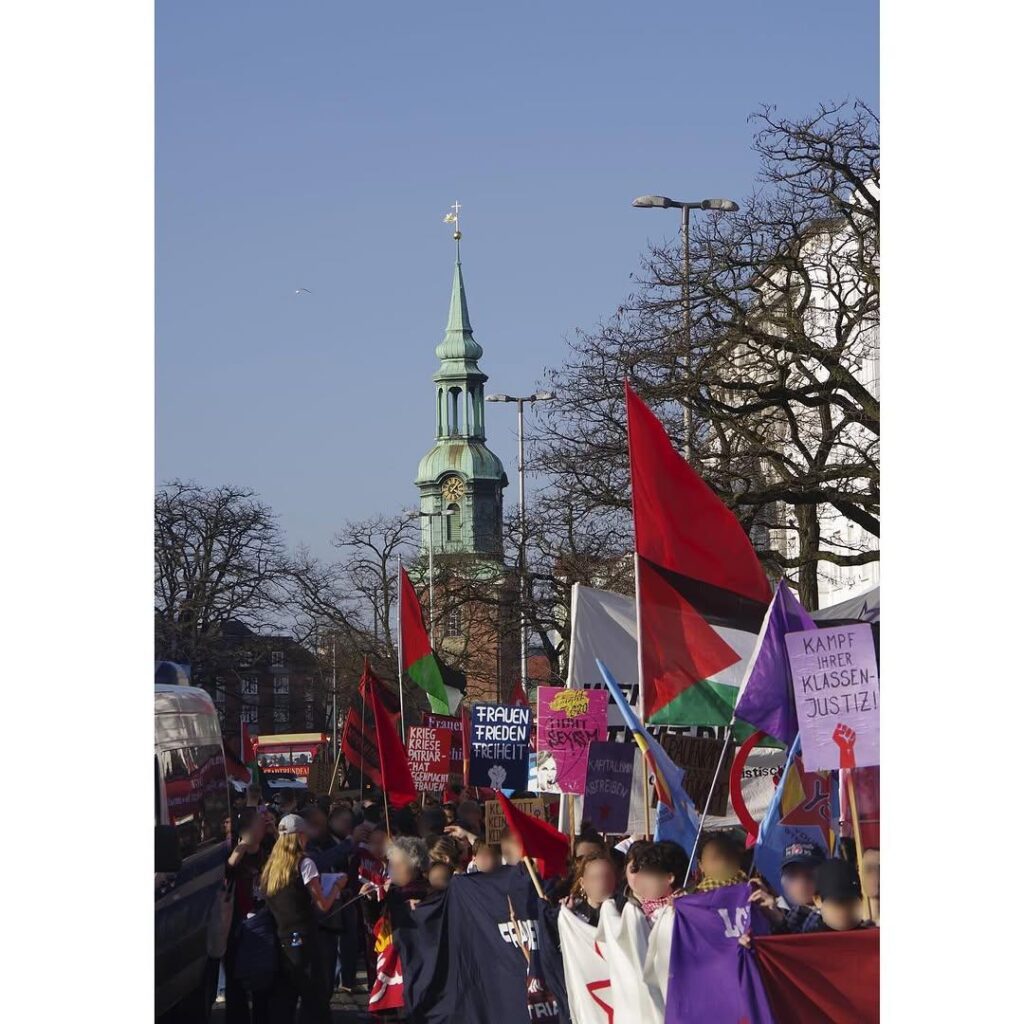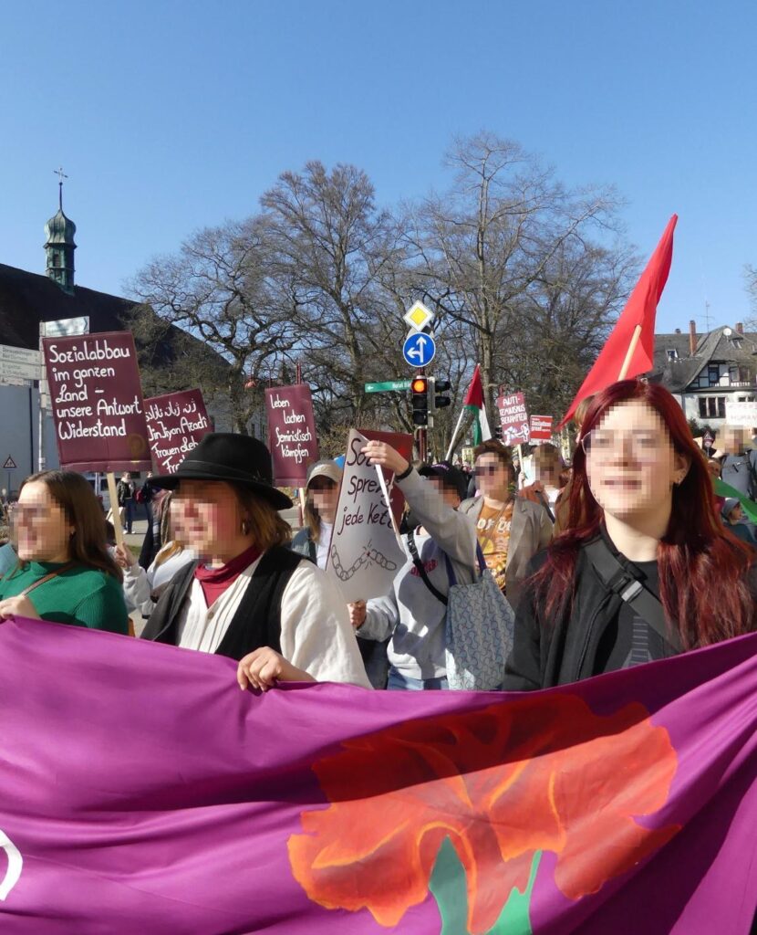 Keine zwei Wochen nachdem rechte, rassistische Hetze den Wahlkampf des gesamten bürgerlichen Parteienspektrums geprägt hatten, den antifeministischen Angriffen von CDU/CSU bis zur AfD, und gleich danach den militaristischen Lügen und der Propaganda nach völlig ungebremster Aufrüstung und Kriegsvorbereitung im Bundestag, in den Medien, waren wir gemeinsam mit tausenden Frauen auf der Straße. Unsere Wut, den Widerstand gegen den Rechtsruck, gegen Sexismus, patriarchale Gewalt, und Unterdrückung, die doppelte Ausbeutung, miese Arbeitsbedingungen und miese Löhne quer durch die Care-Arbeit und den Kriegskurs, haben wir an diesem 8.März gemeinsam auf die Straße getragen.