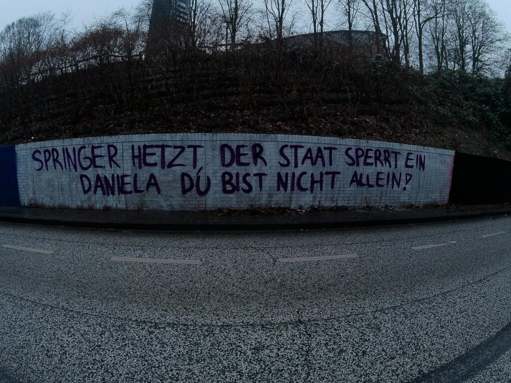 Dem ungebremsten Verfolgungseifer der deutschen Ermittlungsbehörde fast 30 Jahre nach der Selbstauflösung der RAF, begleitet von massiver medialer Hetze und Vorverurteilung setzen wir unsere Solidarität entgegen. Mit der Hetze gegen Daniela und ihre untergetauchten Genossen und den verschärften Haftbedingen im Knast sollen auch unsere Wut und Empörung, die Kontinuität des Widerstands gegen die Verbrechen des Imperialismus diskreditiert und kriminalisiert werden.