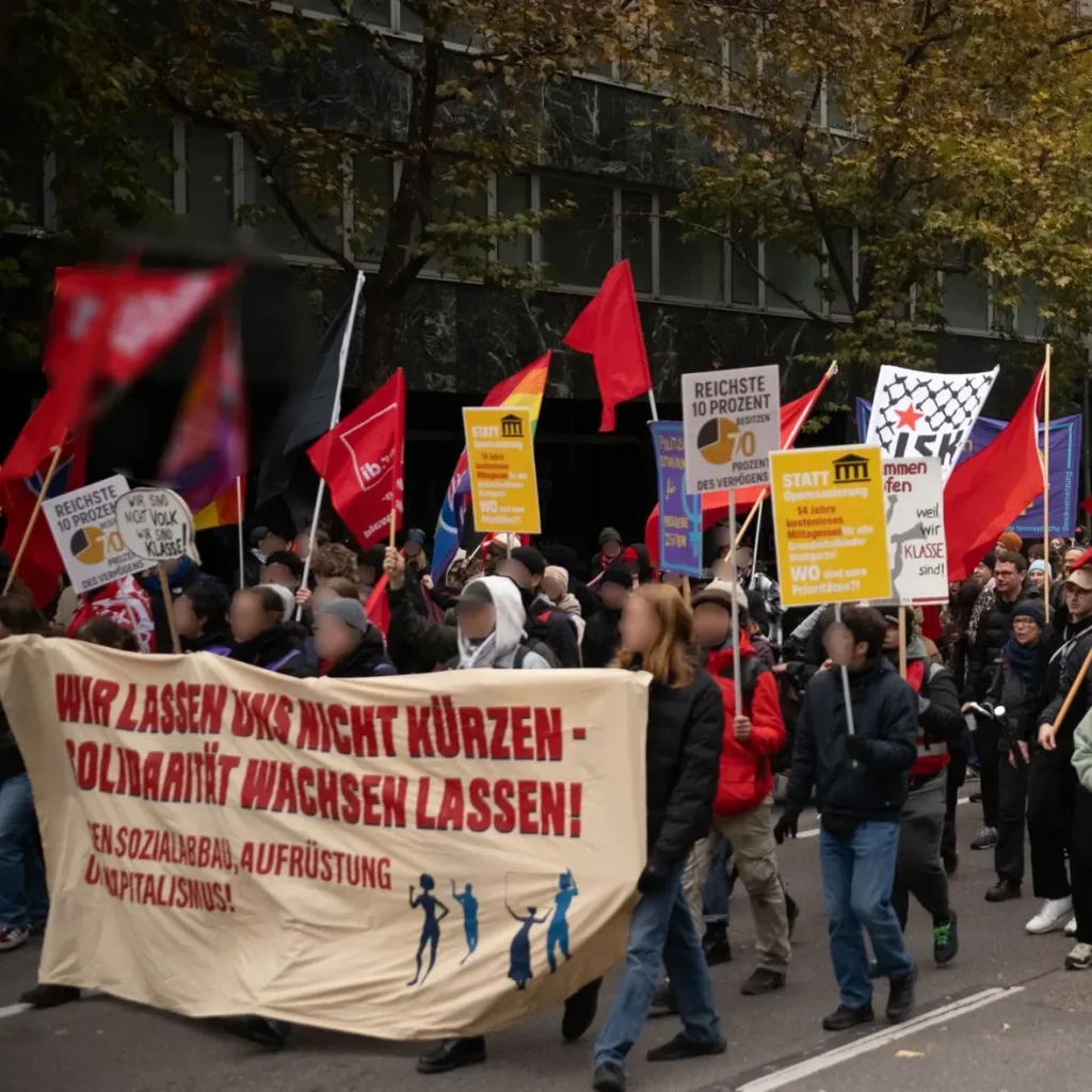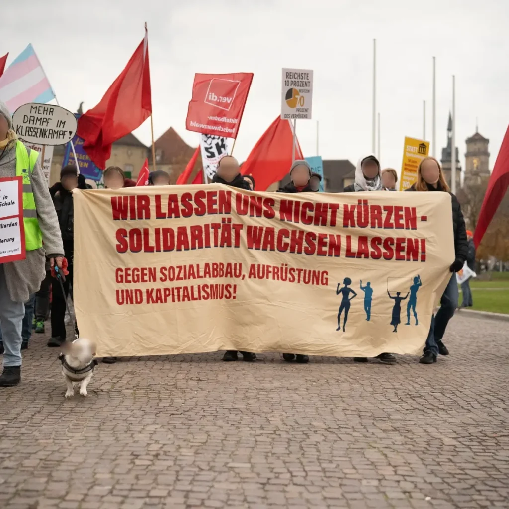 Am 8. November 2025 sind mehrere tausend Menschen im Rahmen der „Kommunen am Limit“ Demonstration in Stuttgart auf die Straße gegangen, um gegen die großangelegten Angriffe auf die Arbeiter:innenklasse zu demonstrieren. Auf dem von ver.di organisierten landesweiten Protest, gab es auch eine große antikapitalistische Beteiligung. Hier einige Eindrücke: