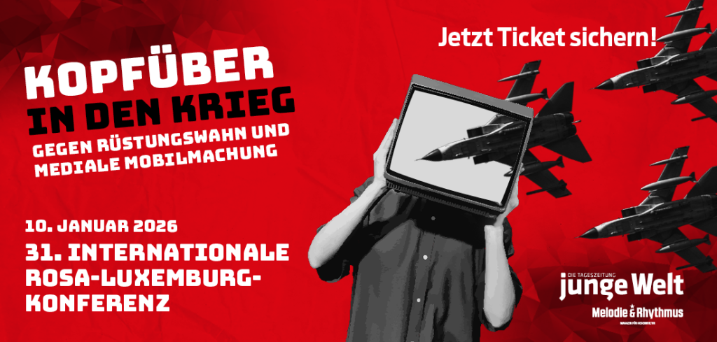Wir werden am Samstag, den 10. Januar auf der alljährlichen Rosa-Luxemburg-Konferenz der marxistisch orientierten Tageszeitung junge Welt präsent sein, die dieses Jahr unter dem Motto „Kopfüber in den Krieg – gegen Rüstungswahn und mediale Mobilmachung“ stattfindet.