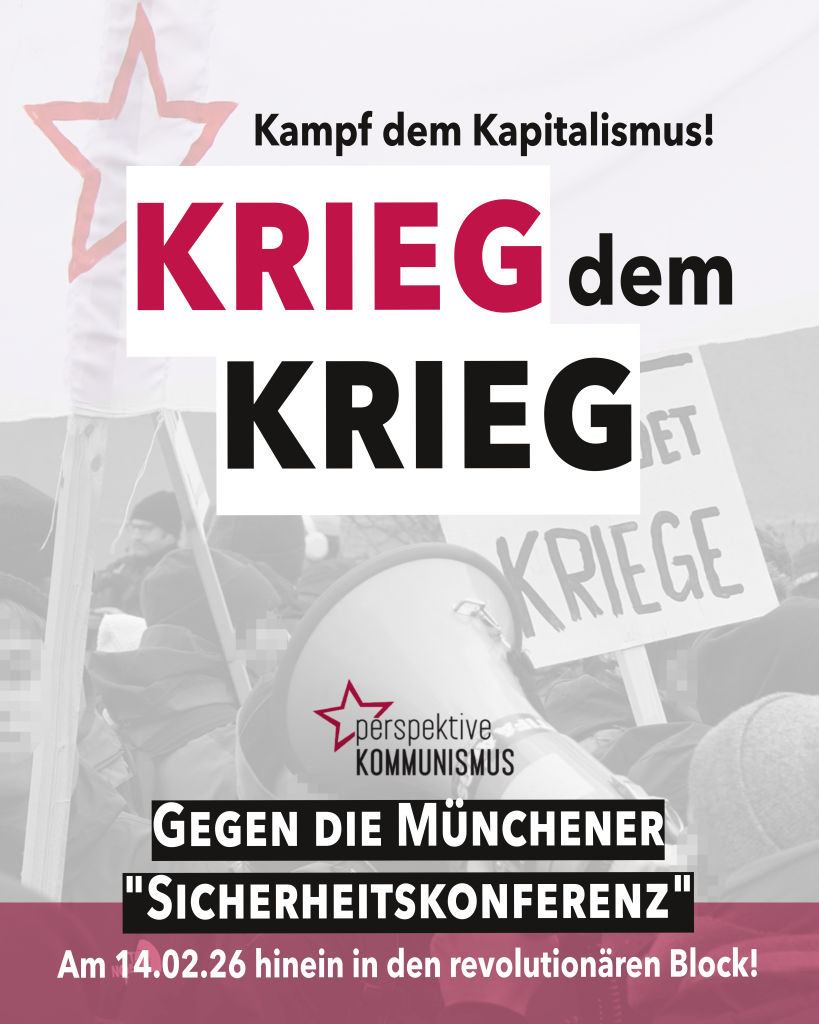 Lassen wir diese Kontinuität nicht abreißen und nutzen wir die Stärke von antimilitaristischen Bündnissen wie dem gegen die Münchener Sicherheitskonferenz und dem Rheinmetall-Entwaffnen Bündnis. Wir werden viel mehr solche Zusammenschlüsse brauchen! Als Perspektive Kommunismus unterstützen wir den Aufruf von „In Aktion gegen Krieg und Militarisierung München“ und rufen ebenfalls dazu auf, am Samstag den 14. Februar 2026 nach München in den revolutionären Block zu kommen. Nutzt die lokalen Strukturen in Bayern und darüber hinaus für gemeinsame Anreisen.