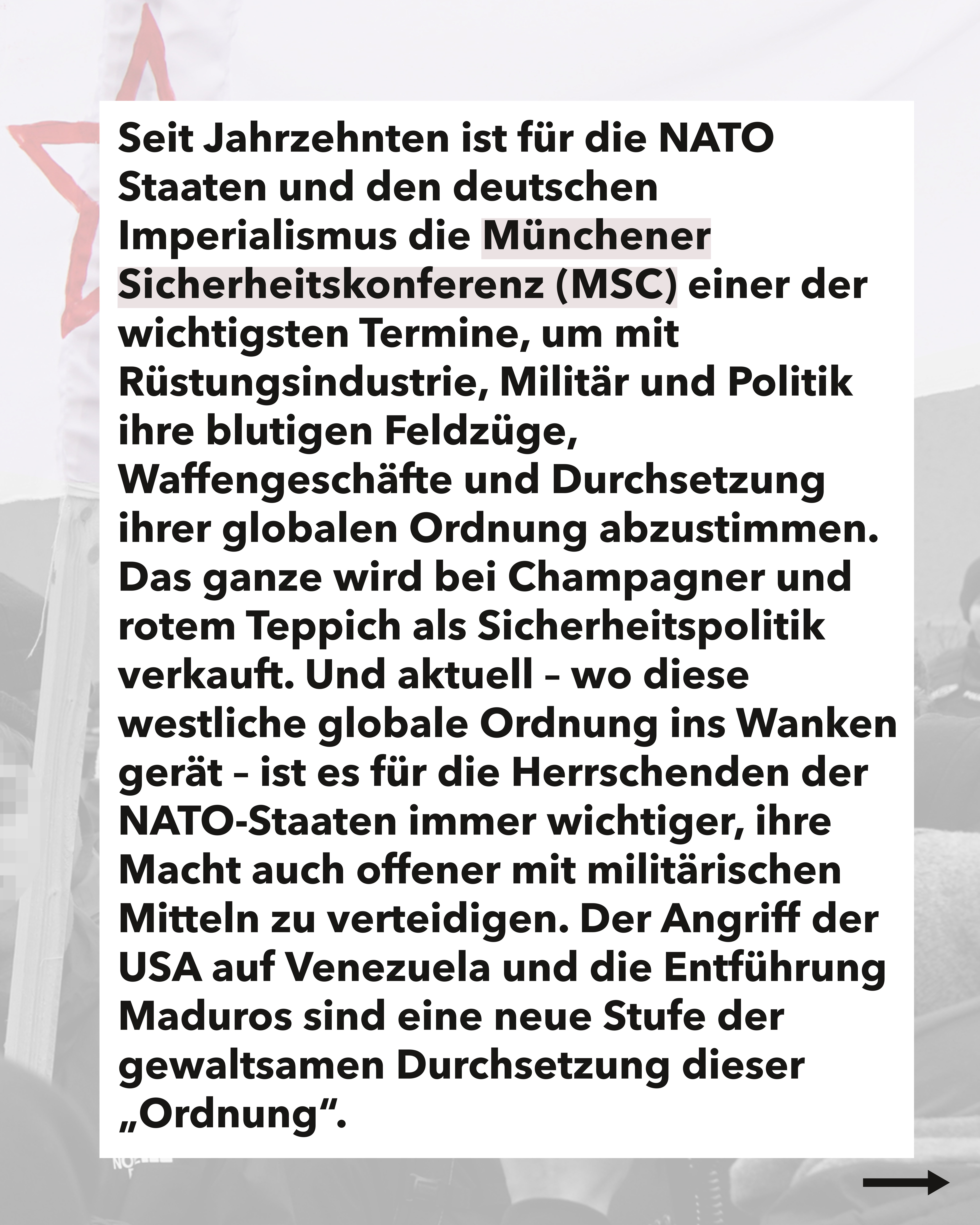 Seit Jahrzehnten ist für die NATO Staaten und den deutschen Imperialismus die Münchener Sicherheitskonferenz (MSC) einer der wichtigsten Termine, um mit Rüstungsindustrie, Militär und Politik ihre blutigen Feldzüge, Waffengeschäfte und Durchsetzung ihrer globalen Ordnung abzustimmen. Das ganze wird bei Champagner und rotem Teppich als Sicherheitspolitik verkauft. Und aktuell – wo diese westliche globale Ordnung ins Wanken gerät – ist es für die Herrschenden der NATO-Staaten immer wichtiger, ihre Macht auch offener mit militärischen Mitteln zu verteidigen. Der Angriff der USA auf Venezuela und die Entführung Maduros sind eine neue Stufe der gewaltsamen Durchsetzung dieser „Ordnung“.