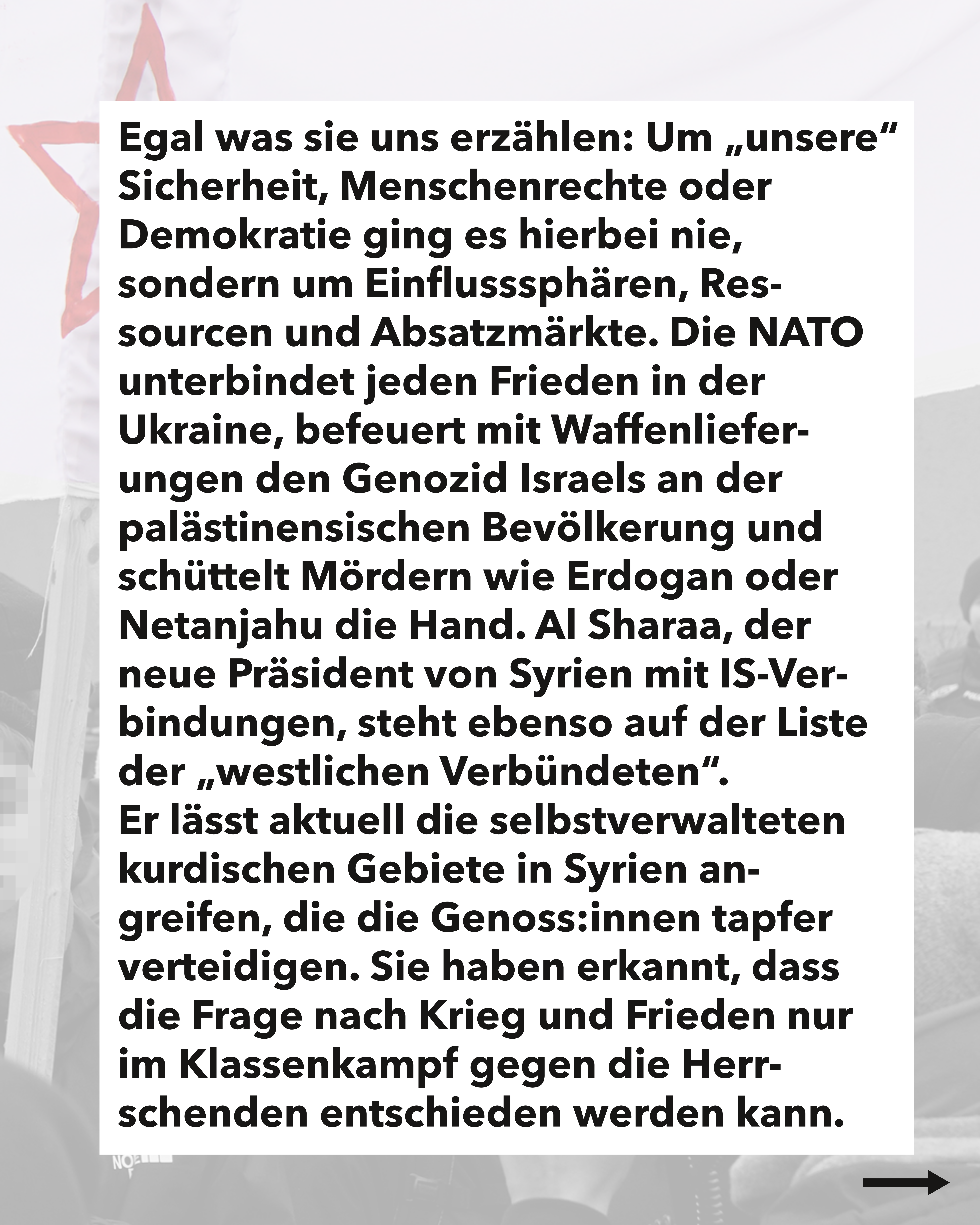 Egal was sie uns erzählen: Um „unsere“ Sicherheit oder um Menschenrechte und Demokratie ging es hierbei nie, sondern um Einflusssphären, Ressourcen und Absatzmärkte. Das wird heute immer deutlicher: Die NATO unterbindet jeden Frieden in der Ukraine, befeuert mit Waffenlieferungen den Genozid Israels an der palästinensischen Bevölkerung und schüttelt Mördern wie Erdogan oder Netanjahu die Hand. Al Sharaa, der neue Präsident von Syrien mit IS-Verbindungen, steht ebenso auf der Liste der „westlichen Verbündeten“. Er lässt aktuell die selbstverwalteten kurdischen Gebiete in Syrien angreifen, die die Genoss:innen dort tapfer verteidigen (aktueller Aufruf von Riseup4Rojava).
