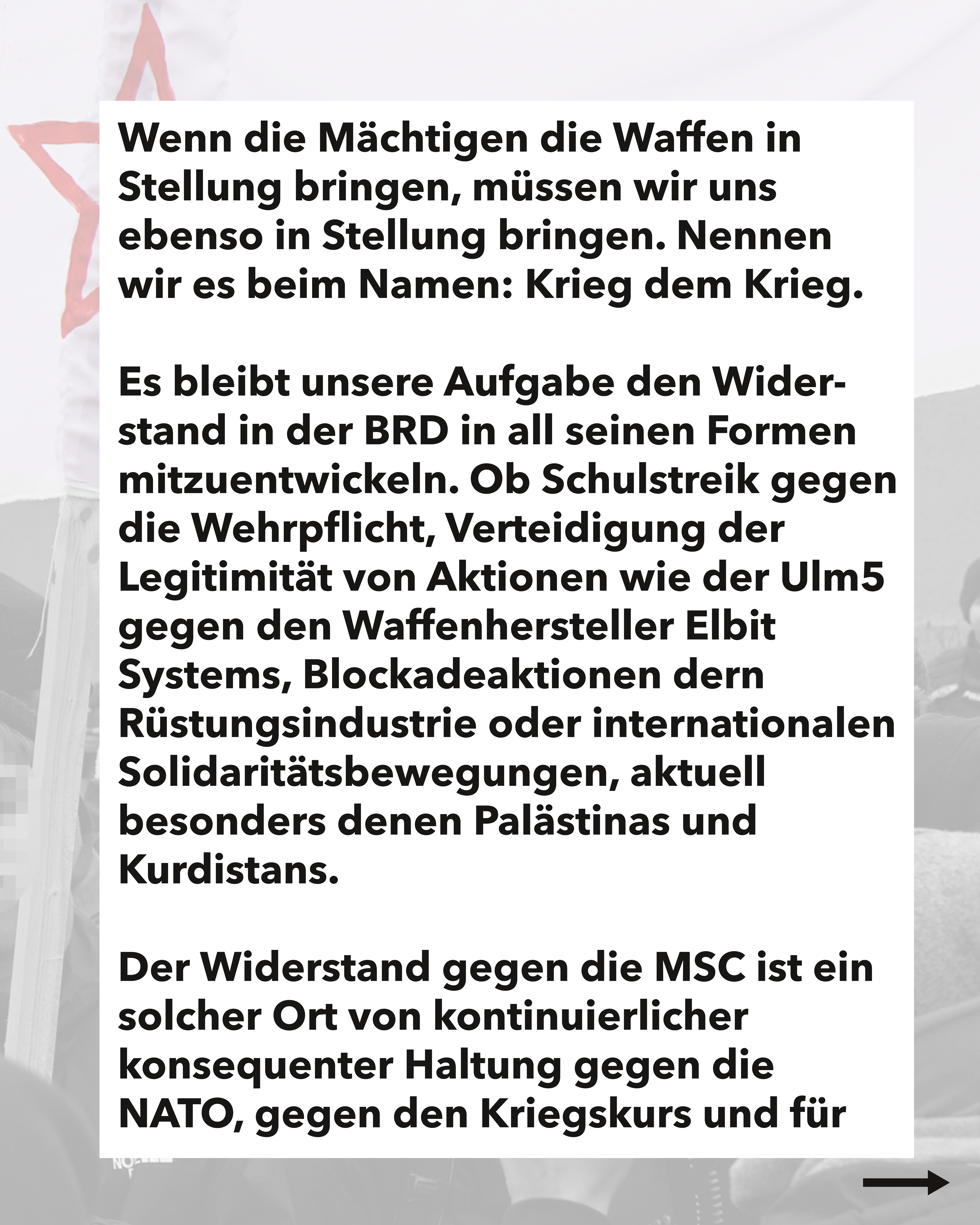 Es bleibt unsere Aufgabe den Widerstand in der BRD in all seinen Formen mitzuentwickeln und Kämpfe zusammenzuführen. Ob Schulstreik gegen die Wehrpflicht, Verteidigung der Legitimität von Aktionen wie der Ulm5 gegen den Waffenhersteller Elbit Systems, Blockadeaktionen der Rüstungsindustrie oder internationalen Solidaritätsbewegungen, aktuell besonders denen Palästinas und Kurdistans.