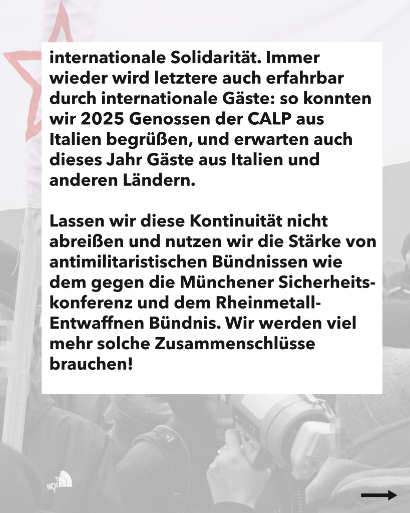 Der Widerstand gegen die MSC ist ein solcher Ort von kontinuierlicher konsequenter Haltung gegen die NATO, gegen den Kriegskurs und für internationale Solidarität. Immer wieder wird letztere auch erfahrbar durch internationale Gäste: so konnten wir 2025 einen Genossen der CALP aus Italien begrüßen, und erwarten auch dieses Jahr Gäste aus Italien und anderen Ländern.