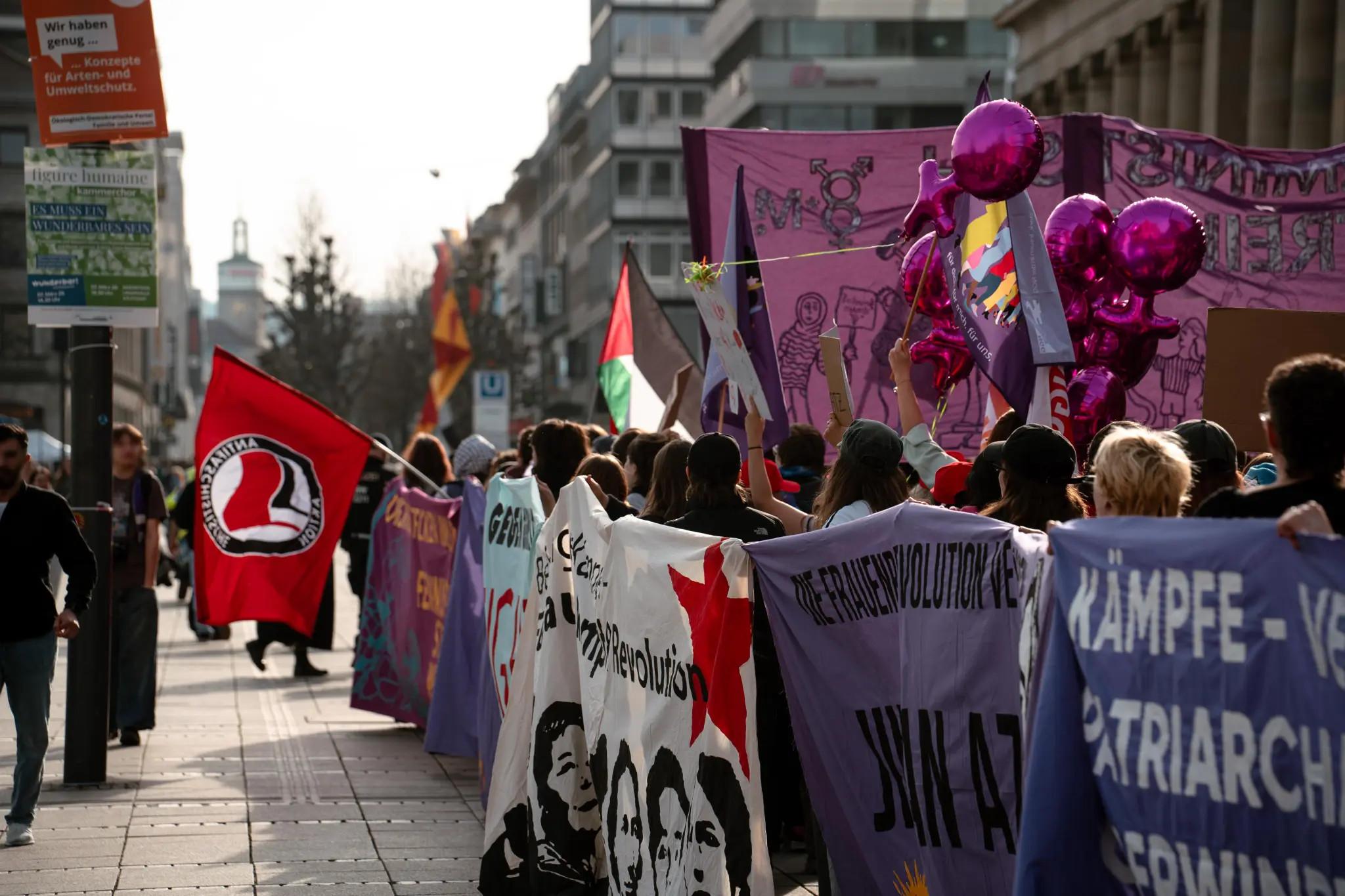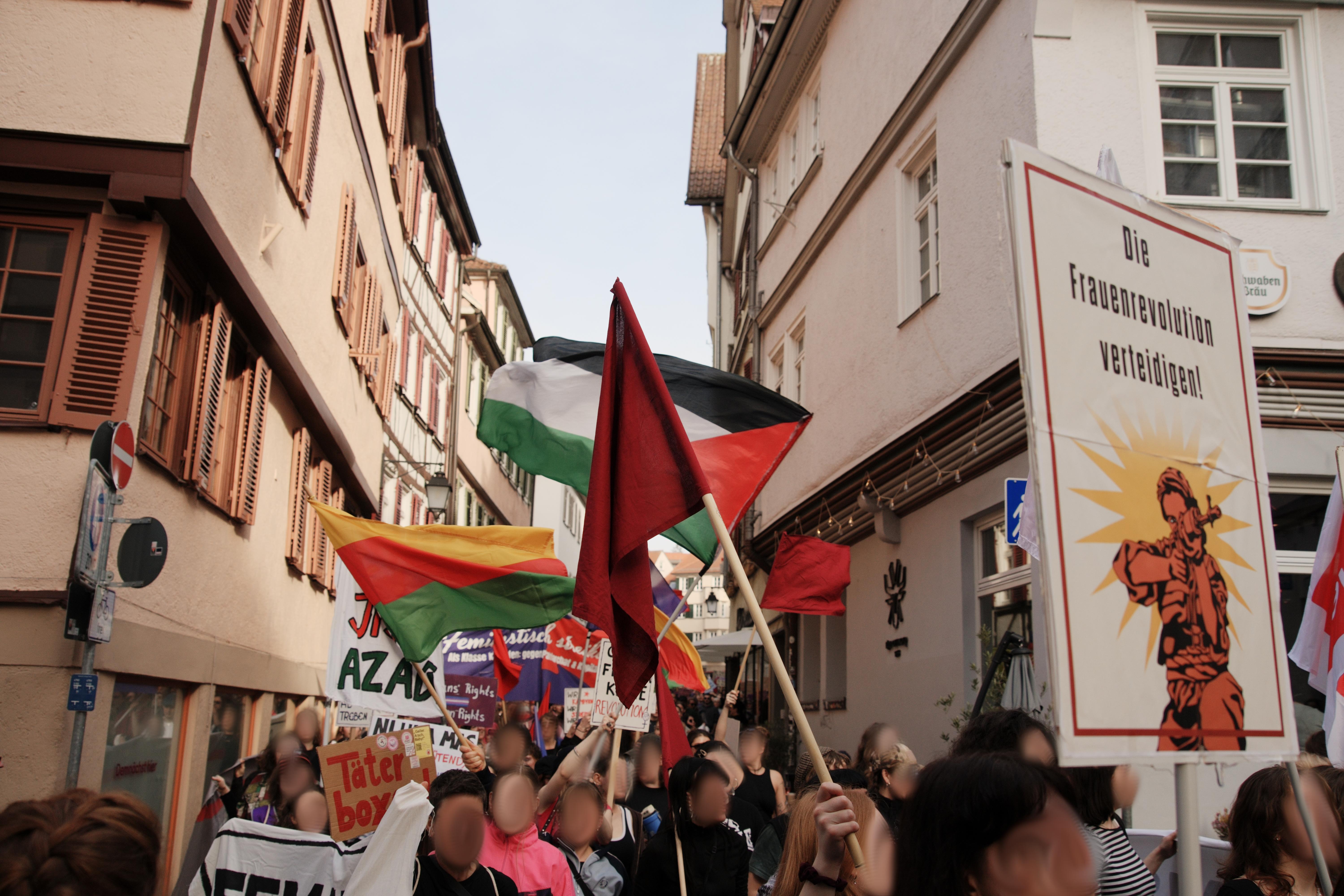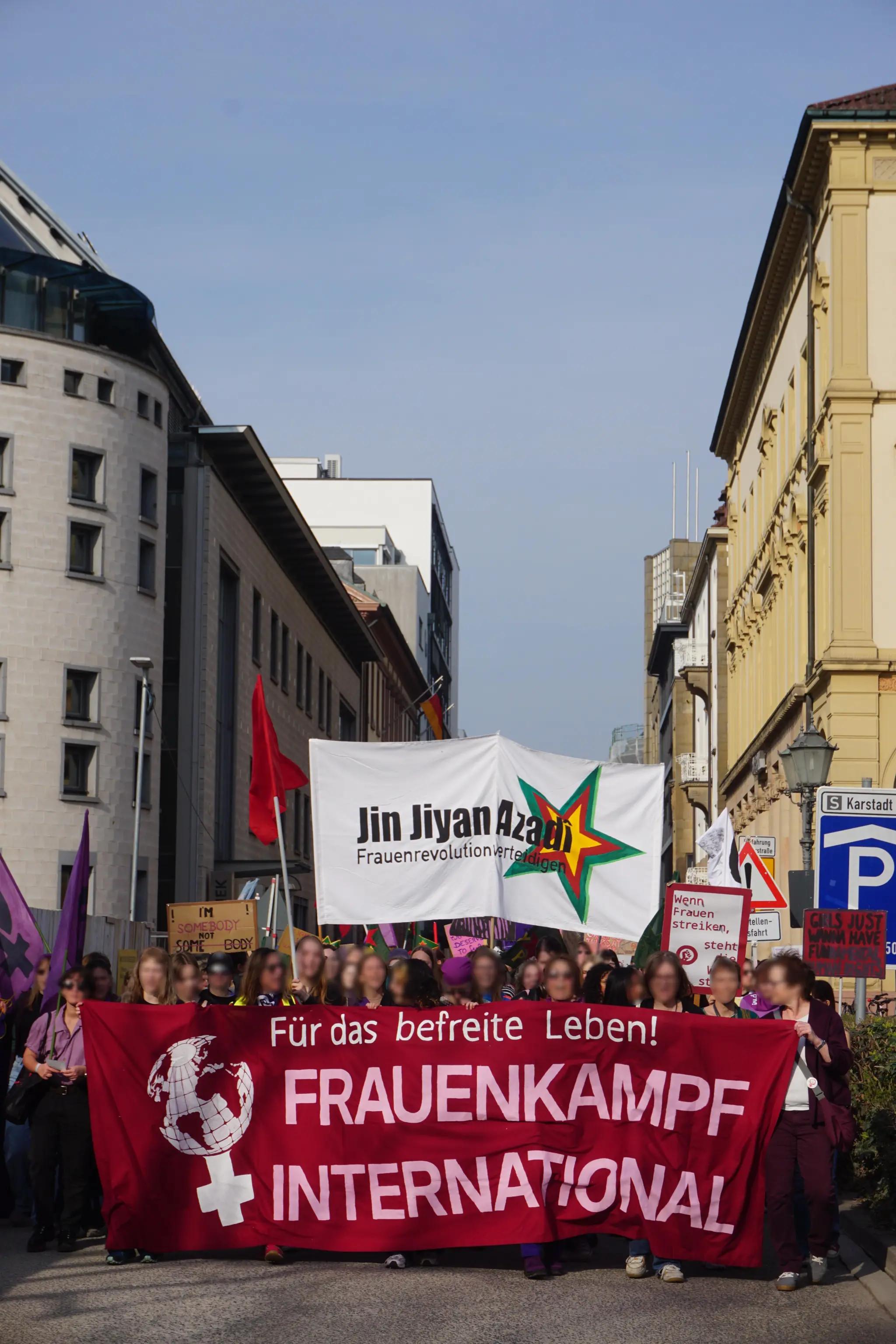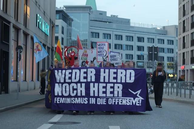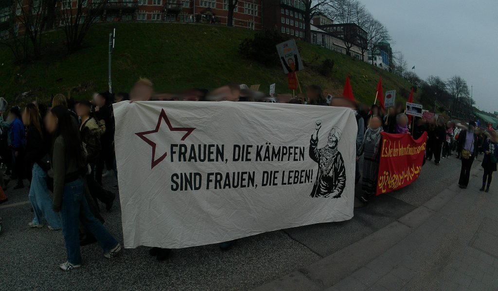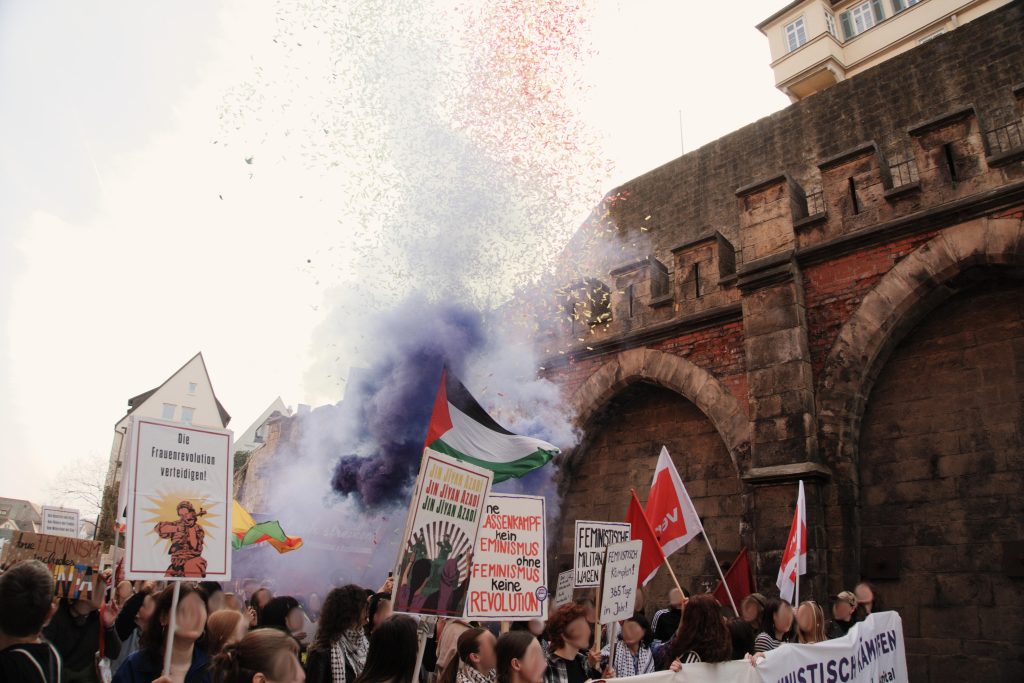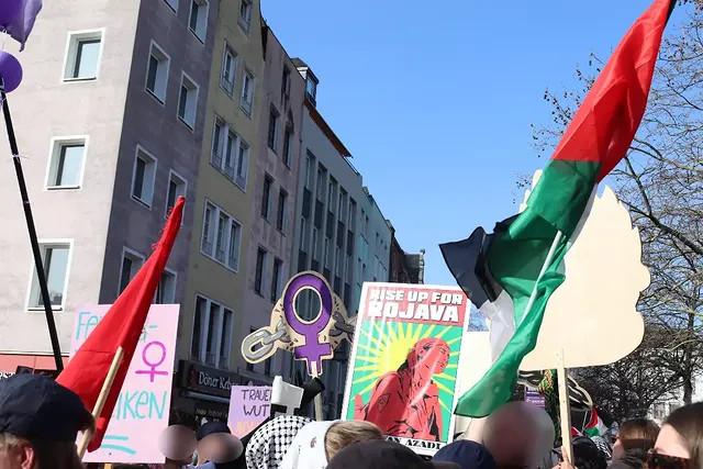 Widerstand gegen die Militarisierung Deutschlands, „Küche, Ehe, Vaterland“ waren kämpferischer Ausdruck der Demos. Genauso wie die Solidarität mit den Frauen die weltweit gegen Unterdrückung und für Befreiung kämpfen: Mit den Kämpferinnen der YPG die die Errungenschaften der Rojavarevolution verteidigen. Mit den Frauen im Iran verbunden mit dem klaren Nein zum Krieg Israels und des US Imperialismus gegen das Land. Für ein freies Palästina. Jin, Jian, Azadî heißt auf der Seite der Frauen, der Arbeiter:innen und der Revolution zu stehen.