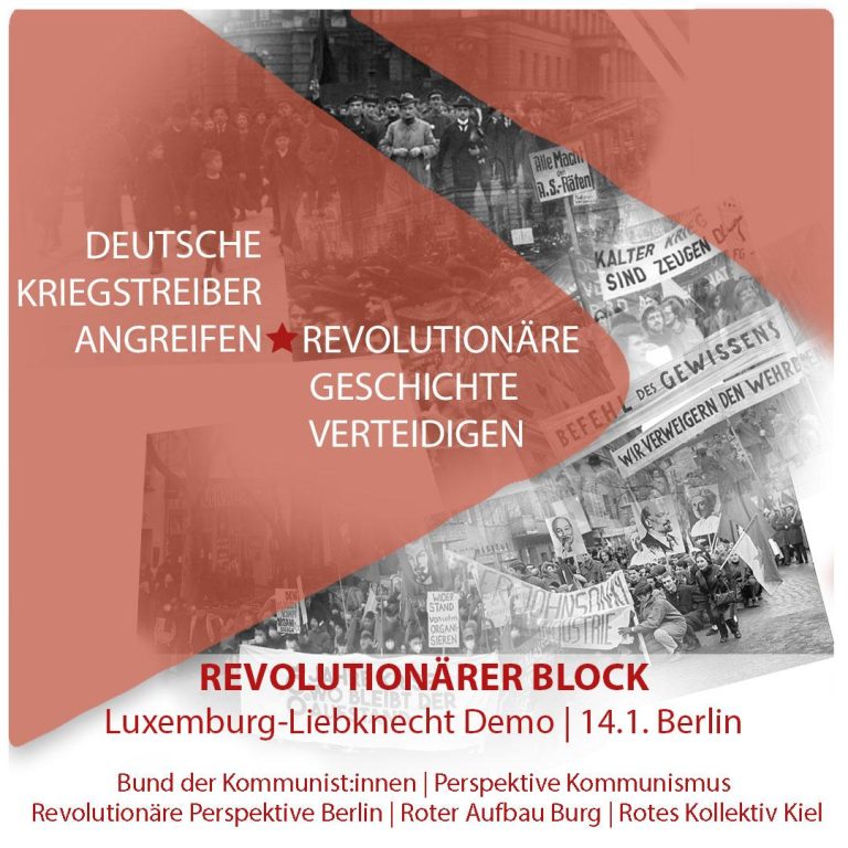 Revolutionärer Block auf der Luxemburg-Liebknecht Demonstration zusammen mit dem Bund der Kommunist:innen, dem Roten Aufbau Burg, der Revolutionären Perspektive Berlin und dem Roten Kollektiv Kiel. Hier ein gemeinsamer Aufruf, Sharepic und Plakat.